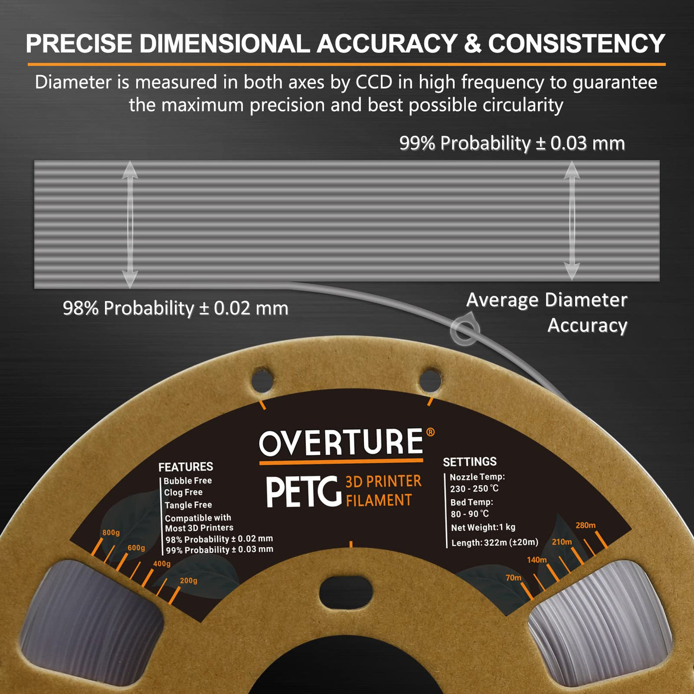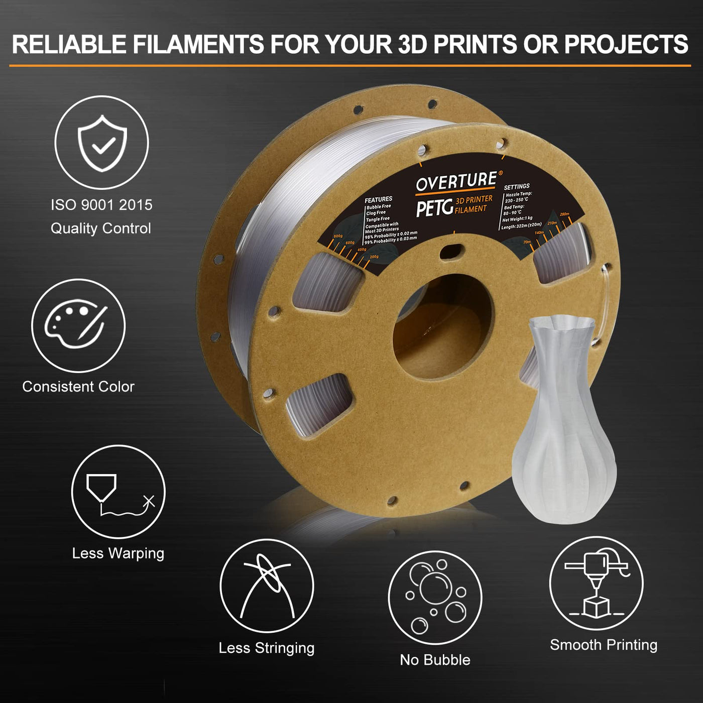Petg Filaments Are Made Of Premium Petg Plastic Which Combines The Advantages Of Other Filaments Such As Safe And Odorless Little Shrinkage Rate High Impact Strength And Good Liquidity (Flows Smoothly) Furthermore, This Beautiful Petg Filaments Make Prints Come Out With A Little Shine Or Spark To Itbuy With Confidence, 100% Satisfaction Guarantee E-Mail Us If You Have Any Issues Or Questions, We Will Make Every Effort To Provide You With Immediate Help Until You Are Satisfiedfaqs:Why Cant The Filaments Stick To The Build Bed1 Check The Temperature Setting Before Printing, Petg Filaments Have Higher Extrusion Temperature Than That Of Pla2 Check If The Plate Surface Has Been Used For A Long Time, It Is Recommended To Replace It With Our New One To Ensure A Strong First Layer Adhesion3 If The First Layer Has Poor Adhesion, It Is Recommended To Re-Level The Print Substrate To Reduce The Distance Between The Nozzle And The Surface Plate4 If The Effect Is Not Good, It Is Recommended To Try Printing The Draft Before Printingspecification:&Nbsptemperature&Nbsprecommended Extrusionnozzle Temp: 230Ac - 250Ac (446 482)Heated Bed Temp: 80Ac - 90Ac (176 194)Filaments Diameter And Accuracy: 175 Mm +- 005Filaments Net Weight: 6 Kg (132 Lbs)&Nbsprecommended Printing Conditions:Cooling Fan: Turned Onprinting Speed: 3050(Mms)Raft Separation Distance: 014(Mm)Retraction Distance: 13 Mm(Note:Based On 04 Mm Nozzle And Simplify 3D V 40 Printing Conditions May Vary With Different Nozzle Diameters)Packaging Included:1 A Spool Of Petg Filaments&Nbsp