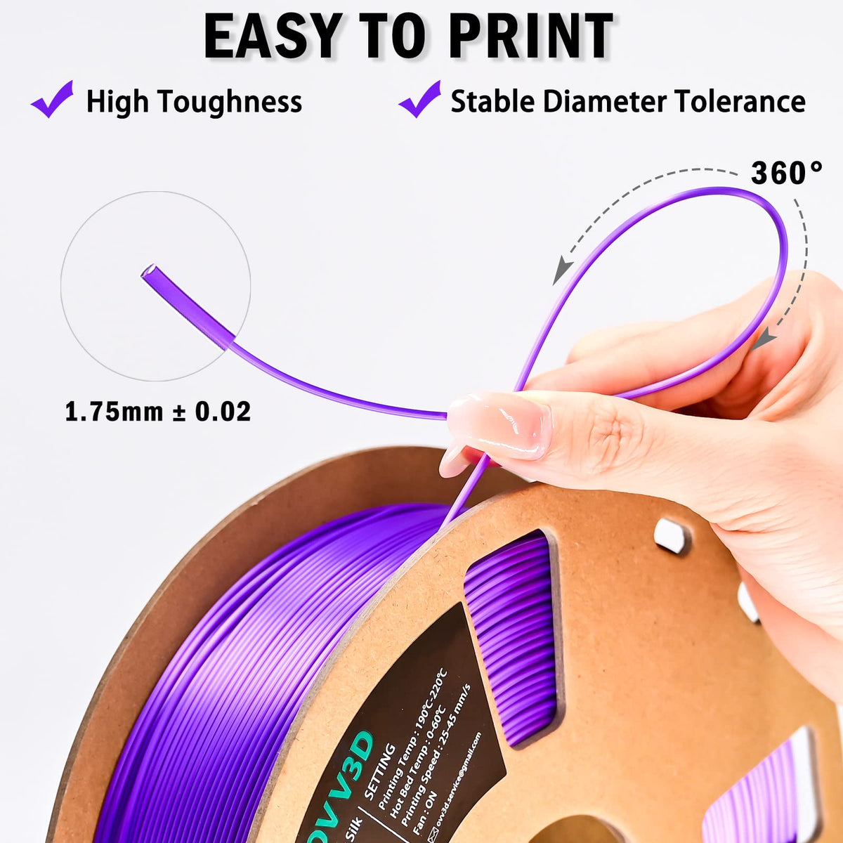 Q: Is the diameter tolerance of this filament reliable for high-quality prints?A: Yes, the OVV3D Silk PLA Filament has a diameter tolerance of +/- 0.02mm, ensuring a stable and consistent extrusion for smoother 3D printing results.
