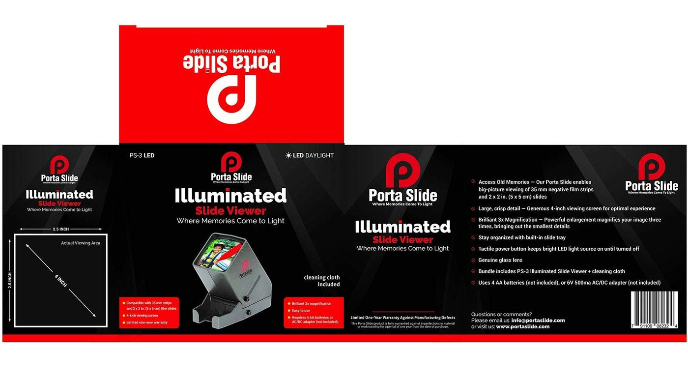 Porta Slide Illuminated Slide Viewer - Where Memories Come To Light!Take A Look At Those Memory Filled Slides, Film Strips And Negatives With Porta Slides Ps-3 Illuminated Slide Viewer!Our Photo Slide Viewer Is Compatible With All 35Mm And 2X2 Inch (5X5Cm) Mounted Slides, And It Has A 4 Inch Viewing Screen.You Can Also Magnify The Image (3X Zoom) -Dont Worry, The Led Light Source Will Allow You To See Everything Clearly!This 35Mm Slide Viewer Is Powered By Either 4 Aa Batteries Or An Ac/Dc Adapter (Not Included). .Comes With An Ultra Soft Microfiber Cleaning Cloth!The 2X2 Slide Viewer Comes With A Microfiber Cleaning Cloth So That You Can Keep Its Genuine Glass Lens Clean And Crystal Clear.The Cleaning Cloth Is Super Soft, So You Can Rest Assured That It Will Not Scratch The Premium Quality Lens Of The Viewing Screen.We Stand Behind Our Ps-3 Illuminated Slide Viewer!Here At Porta Slide Were Very Confident About The Quality Of Our Single Slide Viewer And We Care About Your Satisfaction.For This Reason, We Have Backed Up Our Product With A Limited One-Year Warranty Against Manufacturing Defects.As You Can Tell, This Is A Completely Hassle-Free Purchase, So Place An Order And Get Ready For Some Major Nostalgia!Scroll Up And Click Add To Cart Now!