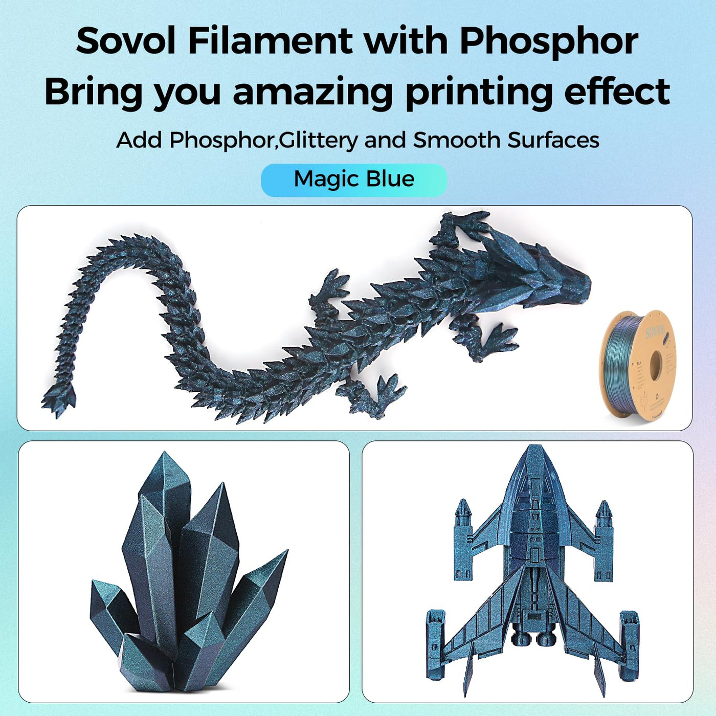 Q: What makes the Sovol Silk PLA Filament color-changing?A: The Sovol Silk PLA Filament features special pigments that respond to different lighting conditions and angles, creating a stunning color-changing effect known as chameleon or shimmering effect. This allows your 3D prints to exhibit dynamic colors, enhancing the visual appeal of your creations.