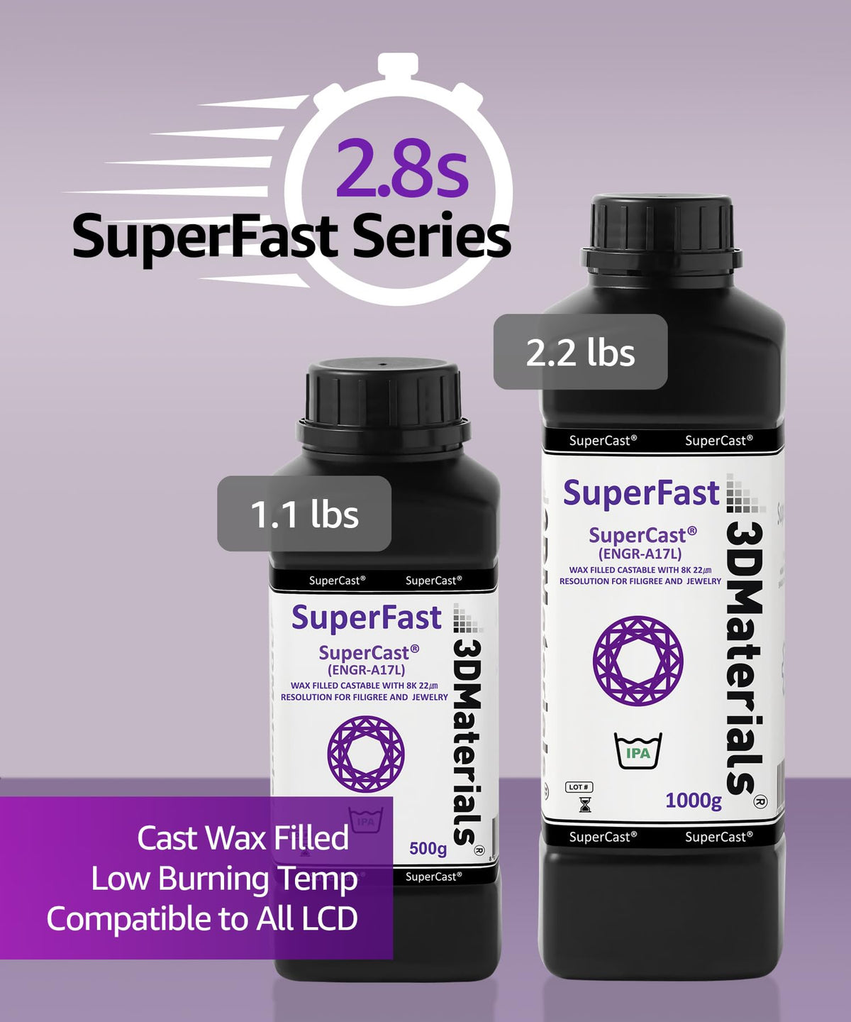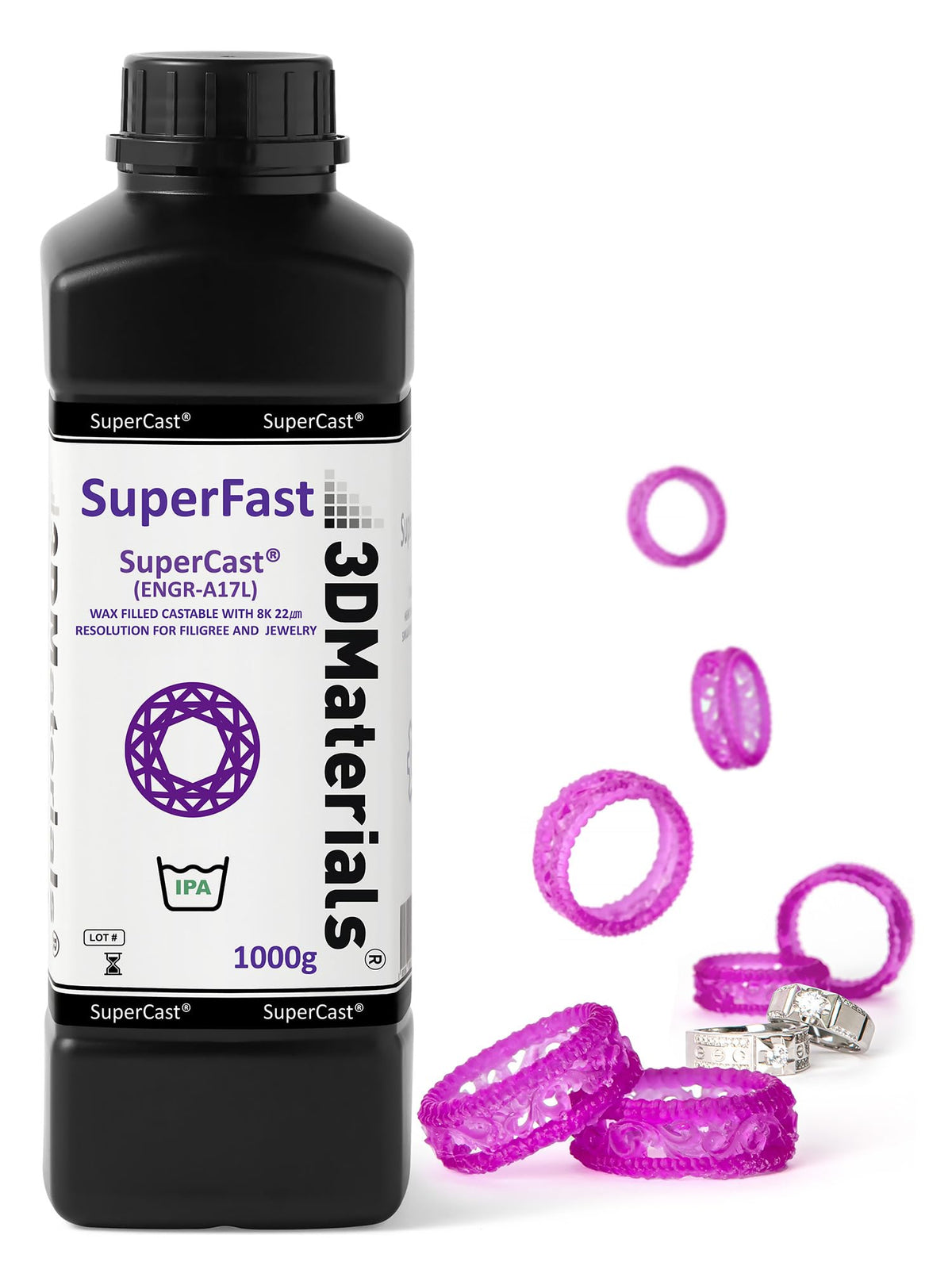 [Wax Filled Strong Print] Supercast Is Wax-Filled Resin That Offers Strength And Stiffness, Making It Capable Of Printing Ultrafine Wire Filigree Designs. [Low Burning Temperature] Supercast Burns Out Completely Even At Lower Temperature Without Any Trace Of Ash, Making It Suitable For Low Temperature Silver, Gold Casting. [Low Viscosity For Precision 8K Printing] Supercast Is Optimized For 4K & 8K Lcd System. Its Very Low Viscosity Allow For Extremely High-Resolution 3D Printing Of Objects At High Speed With 22Um Resolution. [Compatible To All Lcd Printers] Unique Photosensitization Technology Make Supercast Compatible With All Kind Of Regular And Mono Lcd 3D Printers. [Super Series] Superpp 1.4G (Tough And Durable Like Pp), Superpp 0.9G V-0 (Durable With Flame-Retardant Ul94 V-0), Superpcs (Tough And Durable With 8K Precision), Superflex (Flexible Like Tpu), Superrigid (Ceramic Filled 6.0Gpa Modulus), Superelastic (Flexible Like Silicone), Supersilicone (3D Printable Silicone With Ul94 V-0), Superhdt (Highest Hdt Of 464F(240C)), Supercast (Wax Filled Castable), Superesd V-0 (Electrostatic Discharge Safe With Ul94 V-0) Are Also Available As Engineering Resins From 3Dmaterials.