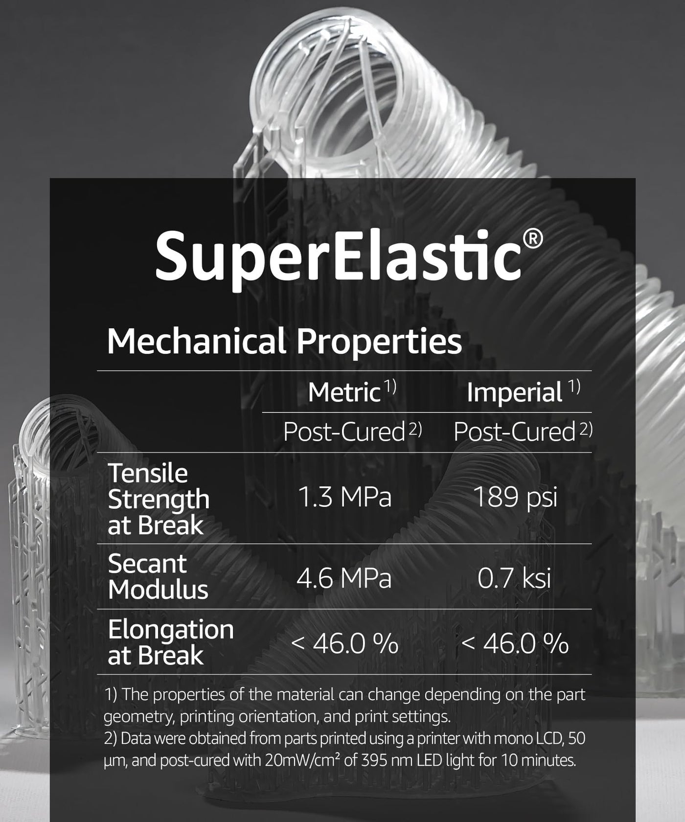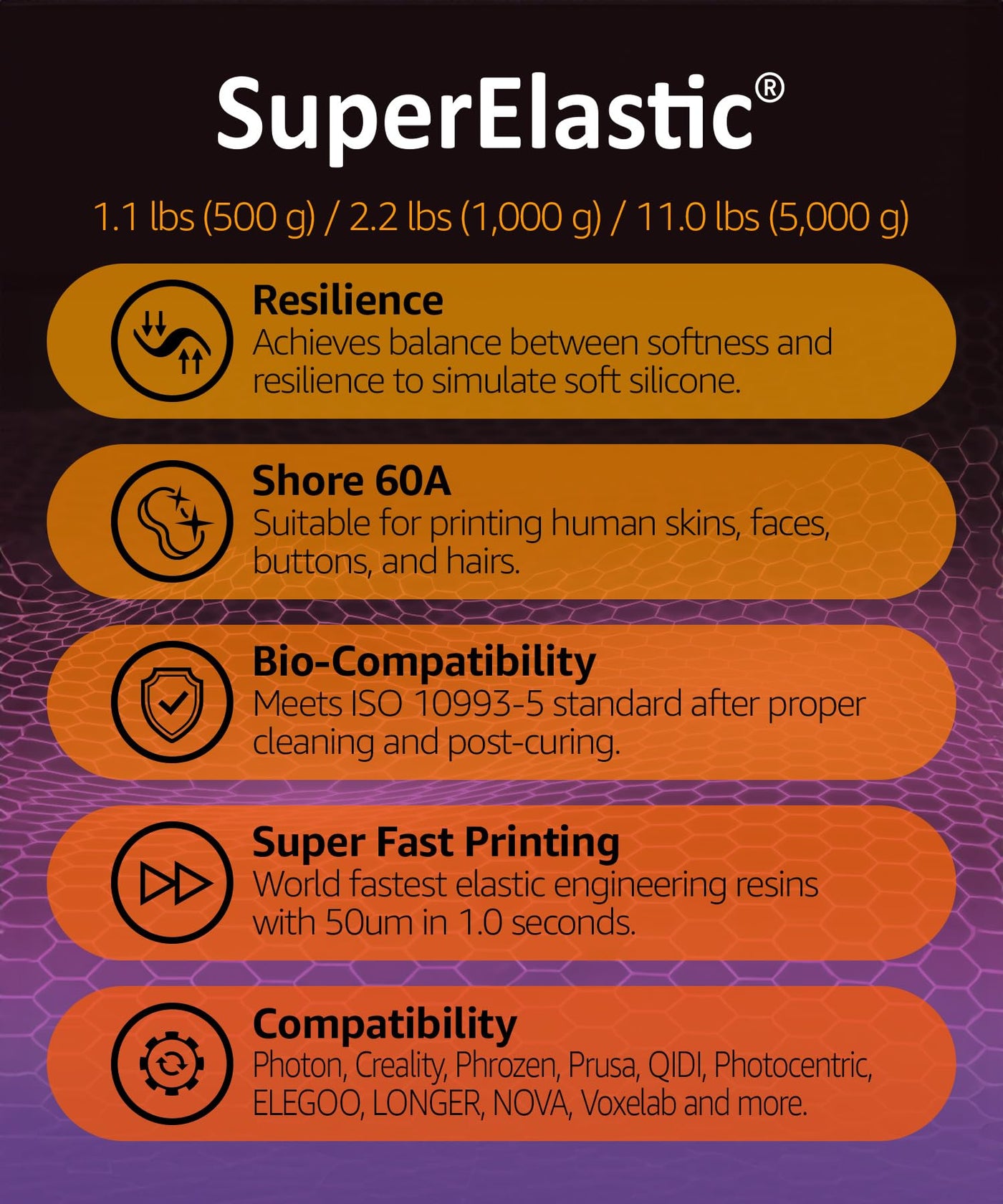 [60A Shore Hardness] Superelastic Has 60A Shore Durometer And 150% Elongation At Break Well-Suited For Printing Human Skins, Faces, Buttons, Hairs. [Balanced Softness With Resilience] Superelastic Has Balanced Softness With Strength To Simulate Soft Silicone Prototypes. [Fast Printing] Unique Photosensitization Technology Developed By 3Dmaterials Allow For Curing 50Um Layer In 1.3 Sec With Monochrome Lcd. [Save Time And Electricity] Super Fast Printing Save Time And Electricity Bill, Enhance The Productivity Of 3D Printing. [Iso 10993-5] Post-Processed And Cured Superelastic Has Passed Iso 10993-5:2009. [Compatible To All Lcd Printers] Unique Photosensitization Technology Make Superelastic Compatible With All Kind Of Regular And Mono Lcd 3D Printers. [Super Series] Superpp 1.4G (Tough And Durable Like Pp), Superpp 0.9G V-0 (Durable With Flame-Retardant Ul94 V-0), Superpcs (Tough And Durable With 8K Precision), Superflex (Flexible Like Tpu), Superrigid (Ceramic Filled 6.0Gpa Modulus), Superelastic (Flexible Like Silicone), Supersilicone (3D Printable Silicone With Ul94 V-0), Superhdt (Highest Hdt Of 464F(240C)), Supercast (Wax Filled Castable), Superesd V-0 (Electrostatic Discharge Safe With Ul94 V-0) Are Also Available As Engineering Resins From 3Dmaterials.
