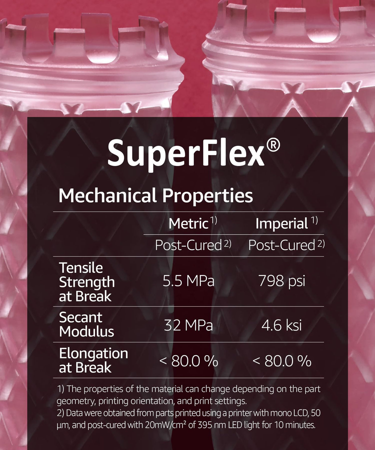 [Fast Printing] Unique Photosensitization Technology Developed By 3Dmaterials Allow For Curing 50Um Layer In 1.7 Sec With Monochrome Lcd. [Save Time And Electricity] Super Fast Printing Save Time And Electricity Bill, Enhance The Productivity Of 3D Printing Farms. [Balanced Softness & Strength] Superflex Has Balanced Softness With Strength To Simulate Rubber Or Tpu For Hard Flexible Prototypes. [80A Shore Hardness] Superflex Has 80A Shore Durometer And 150% Elongation At Break Well-Suited For Cushioning, Damping And Shock Absorption. [Iso 10993-5] Post-Processed And Cured Superflex Has Passed Iso 10993-5:2009. [Compatible To All Lcd Printers] Unique Photosensitization Technology Make Superpp Compatible With All Kind Of Regular And Mono Lcd 3D Printers. [Super Series] Superpp 1.4G (Tough And Durable Like Pp), Superpp 0.9G V-0 (Durable With Flame-Retardant Ul94 V-0), Superpcs (Tough And Durable With 8K Precision), Superflex (Flexible Like Tpu), Superrigid (Ceramic Filled 6.0Gpa Modulus), Superelastic (Flexible Like Silicone), Supersilicone (3D Printable Silicone With Ul94 V-0), Superhdt (Highest Hdt Of 464F(240C)), Supercast (Wax Filled Castable), Superesd V-0 (Electrostatic Discharge Safe With Ul94 V-0) Are Also Available As Engineering Resins From 3Dmaterials.