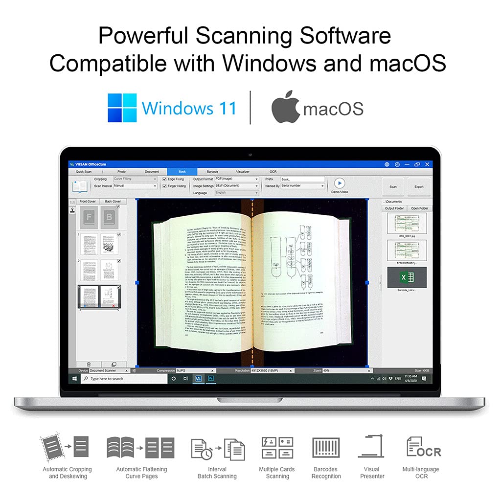 Large A2 Size Scanning At 594X420 Mm. Excellent 26Mp Super High-Resolution Output (5888X4522 Pixels). Ideal For Scanninglarge Format Journals, Manuscripts, Newspapers, And Maps. Smart Book Curved Page Flattening Technology. Fast Scanningspeeds Up To 1.5 Seconds Per Page. Built-In High Brightness Led Lamp That Allows You To Take Clear Photos Even In The Dark. Height Adjustable (A2/A3) Design With 90 Degree Foldable Hinge Powerful Ocr Feature Allows You To Convert Scanned Images Into Searchable Pdf And Editable Word, Excel, And Text Formats Support Windows And Macos With 1-Year Warranty.Specificationimage Sensor:20.1-Megapixel Cmos Sensormax. Shooting Area:A2 ( 594X420) Mmcolor Bit Depth:24 Bitlens Focus:Fixedlight Source:Built-In Ledscanning Speed:1 Sec. Per A2 Pagevideo Compression:Mjpgpower:5V By Usb-Powerednet Weight:Approx. 1Kgaccessoriesusb Cable X 1Scanning Pad X 1Getting Started X 1Hand Button X 1Bundled Softwareofficecam For Windowsdeskcam For Mac (Support Apple M1-Chip Macs)Max. Resolutionsoftware Interpolation: 5888X4522 Pixels (26Mp)Optical: 5504X4128 Pixels (23Mp)Output Format By Softwarepicture: Jpgdocument: Pdf(Image), Pdf (Searchable), Pdf (Text), Excel, Word, Texte-Book: Epubtext To Speech: Mp3, Wav (Windows Only)Video: Avi, Mp4, Flvvideo Streaming Frame Ratevideo Mode: 1920 X 1080@30Fpssoftware Preview Window: 2048 X 1536@15Fpsvideo Compression:Mjpginterfaceusb 2.0 Type B X 1 (For Pc Connection)Usb 2.0 Type-A X 1 (For Usb Extension)Dimensionsfolded Size:112 (L) X 210 (W) X 395 (H) Mmworking Size: 360 (L) X 210 (W) X 355 (H) Mm In A3 Statusworking Size: 360 (L) X 210 (W) X 475 (H) Mm In A2 Statussystem Requirementswindows 7, Windows 8.1, Windows 10Macos 10.12 Or Later