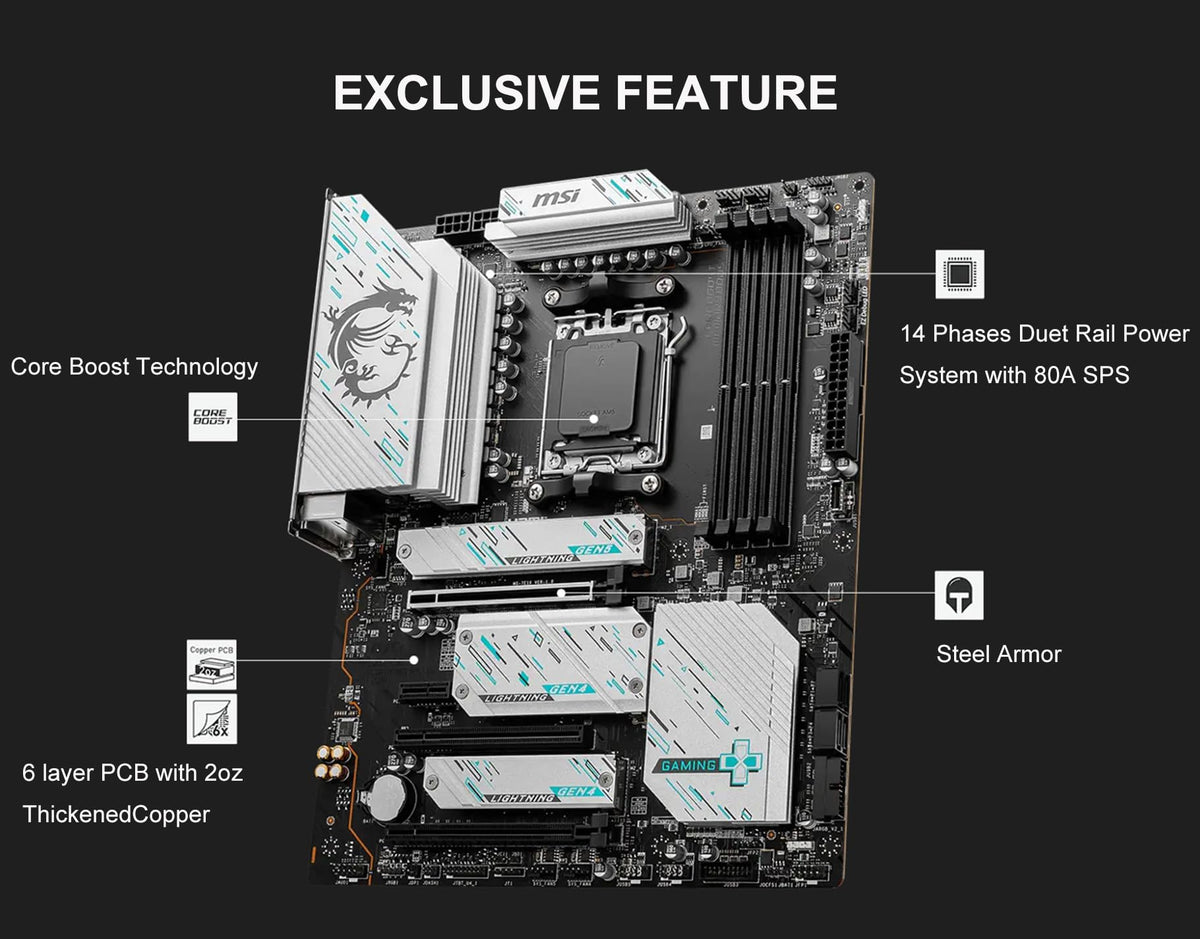 Amd Ryzen 7 7700X Desktop Processor, 8-Core, 16-Thread, 5.4 Ghz Max Boost, Unlocked For Overclocking, 40 Mb Cache, Ddr5-5200 Support, Default Tdp 105W. This Dominant Gaming Processor Can Deliver Fast 100+ Fps Performance In The World'S Most Popular Games | For The State-Of-The-Art Socket Am5 Platform, Can Support Pcie 5.0 On Select 600 Series Motherboards. Os Support: Windows 11/ 10-64-Bit Edition. Cooler & Thermal Solution (Pib) Not Included | Msi X670E Gaming Plus Wifi Gaming Motherboard, Atx Form Factor, Support Am5 Cpu Socket, Supports Ddr5 Dual-Channel Memory Up To 256Gb, Supports Non-Ecc, Un-Buffered Memory, Pcie 5.0 Supports, 1X Pcie 5.0 X4 M.2 Slot, 4X Pcie 4.0 X4 M.2 Slot, 4X Sata 6Gb/S, Usb 3.2 Gen2X2 Type C, Wi-Fi 6E, Supports Bluetooth 5.3, Support For Windows 11/10 64-Bit | Supports Ddr5 Memory, Up To 7800+(Oc) Mhz;/ Enhanced Power Design: 14+2+1 Duet Rail Power System, Dual 8-Pin Cpu Power Connectors, Core Boost, Memory Boost;/ Lightning Fast Game Experience: Pcie 5.0 Slot, Lightning Gen5 M.2, Usb 3.2 Gen 2X2 | Premium Thermal Solution: Extended Heatsink Design And M.2 Shield Frozr Are Built For High Performance System And Non-Stop Works;/ High Quality Pcb: 6-Layer Pcb Made By 2Oz Thickened Copper And Server Grade Level Material;/ Audio Boost: Reward Your Ears With Studio Grade Sound Quality For The Most Immersive Gaming Experience