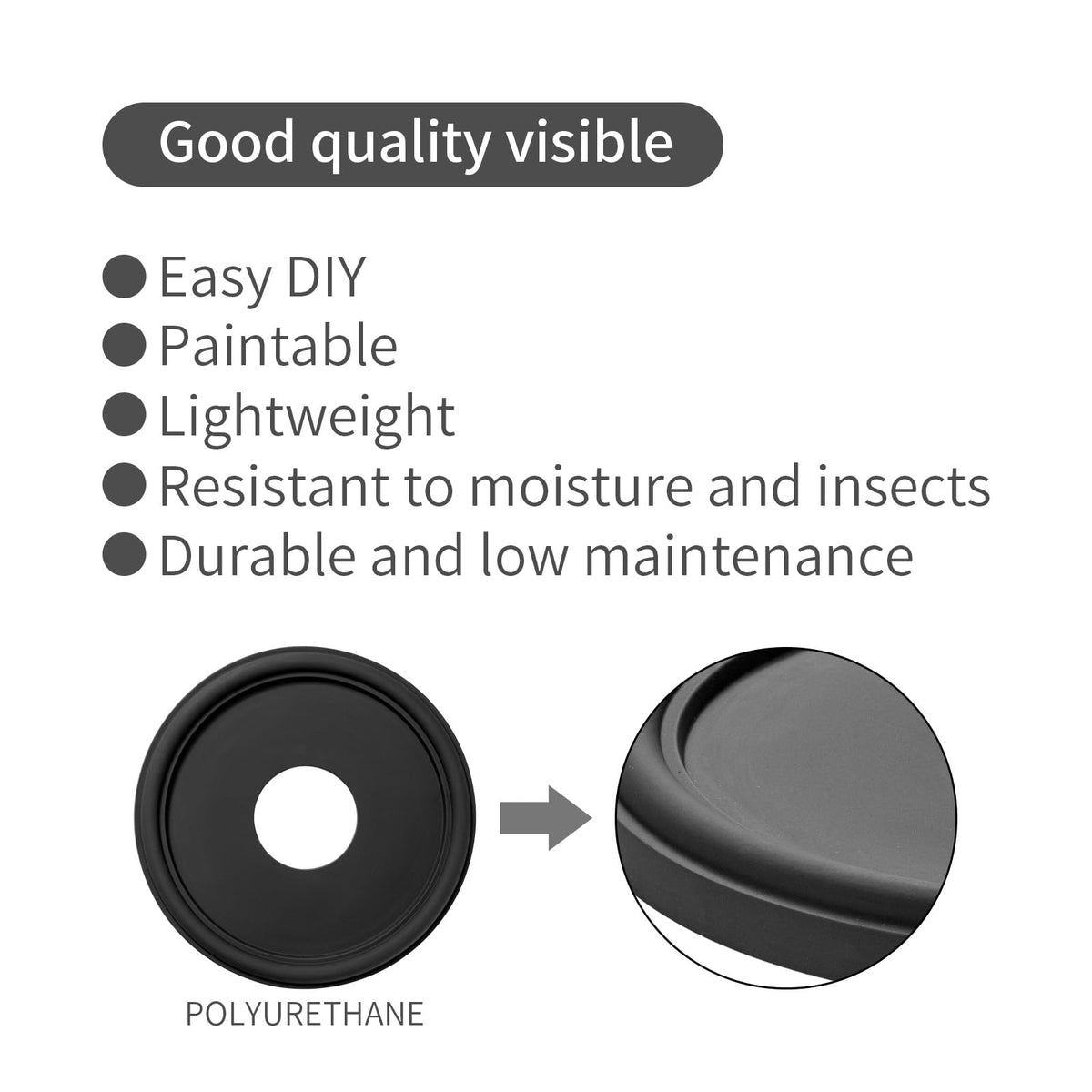 Q: Is the material used in this medallion durable?A: Absolutely. The ceiling medallion is made of thermoformed polyurethane (PU), which is lightweight, dent-resistant, waterproof, and designed for a longer service life compared to traditional materials.