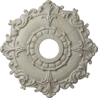 Q: What are the dimensions of the ceiling medallion?A: The Ekena Millwork CM18RLPCC ceiling medallion has an outside diameter of 18 inches, an inside diameter of 3-1/2 inches, and a projection of 1-1/2 inches.