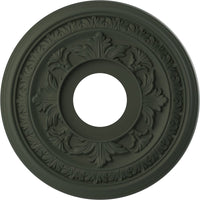 Q: What are the dimensions of the Ekena Millwork CMP13BAGHC ceiling medallion?A: The Ekena Millwork CMP13BAGHC ceiling medallion has an outside diameter of 13 inches, an inside diameter of 3-1/2 inches, and a projection of 3/4 inches, making it suitable for canopies up to 5-1/4 inches.