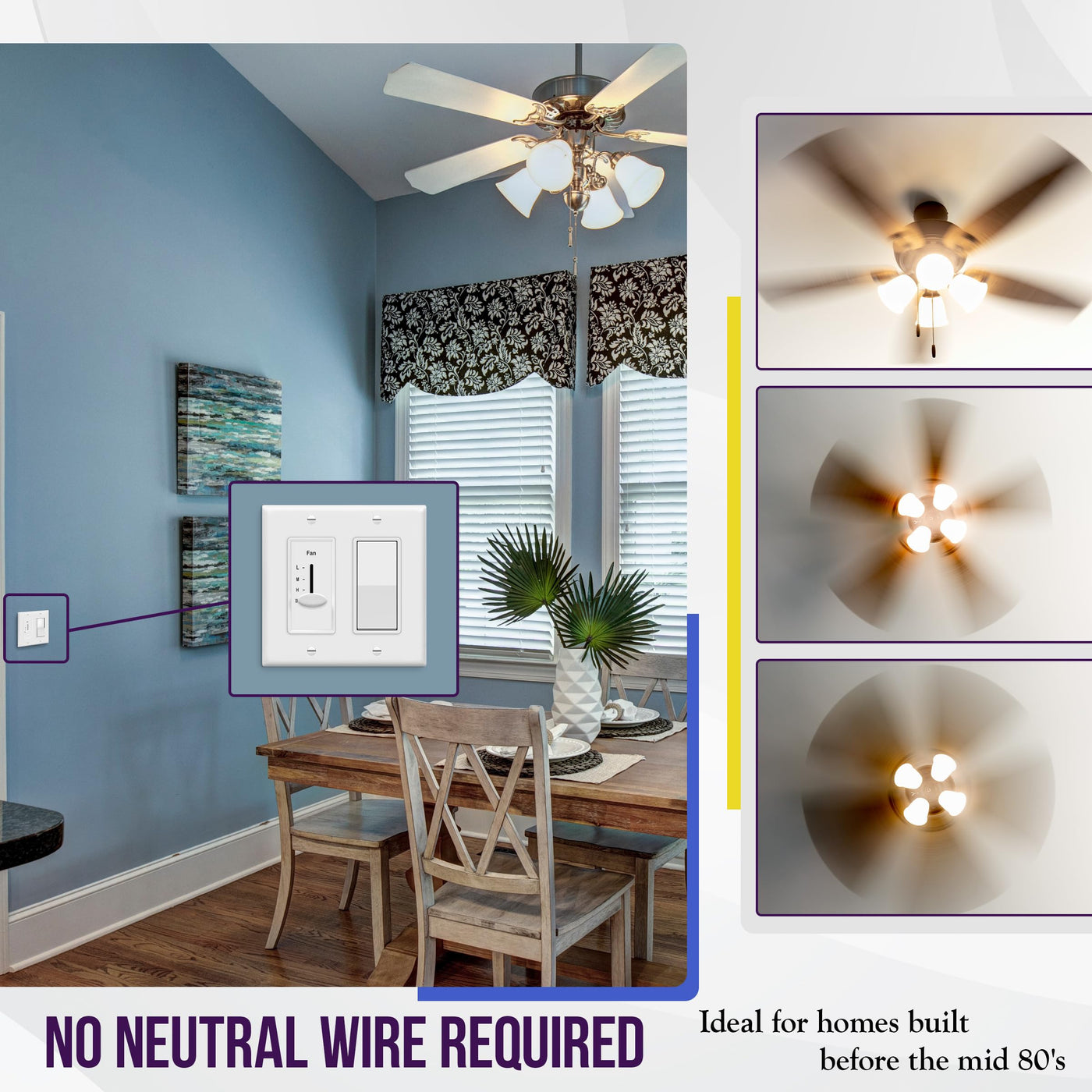 Enerlites 3 Speed In Wall Ceiling Fan Control, Slide Switch, 120Vac, 2.5A, Single Pole, No Neutral Wire Required, 17000 F3 W F,