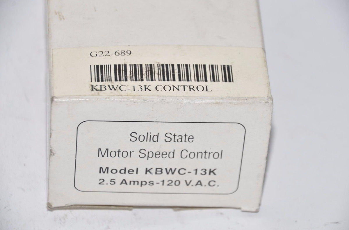 The Kbwc-13K Is A Distributor Packaged Solid State Ac Motor Speed Fan Control. It Is Designed For Mounting In A 2'' X 4'' Electrical Wall Box. It Operates From 115 Vac 50/60 Hz And Has A Maximum Rating Of 2.5 Amps @ 25C. The Kbwc-13K Provides Infinitely Variable Speed Motor Control For Shaded Pole Permanent Split Capacitor And Universal (Ac/Dc) Motors. The Variable Speed Motor Control Contains An On/Off Line Switch A High Gain Rfi Noise Suppression Filter A Minimum Speed Trimpot And A Flame Retardant Abs Enclosure. Applications Include Range Hoods Vibrators Humidifiers Fireplace Blowers Fans Laminar Flow Hoods Heat Tunnels And Stirrers. See Data Sheet D-160 For Optional Features. The ''K'' Suffix Indicates Mounting Kit That Includes Individual Packaging With Dial Plate Knob Mounting Screws Wire Connectors And Instruction.