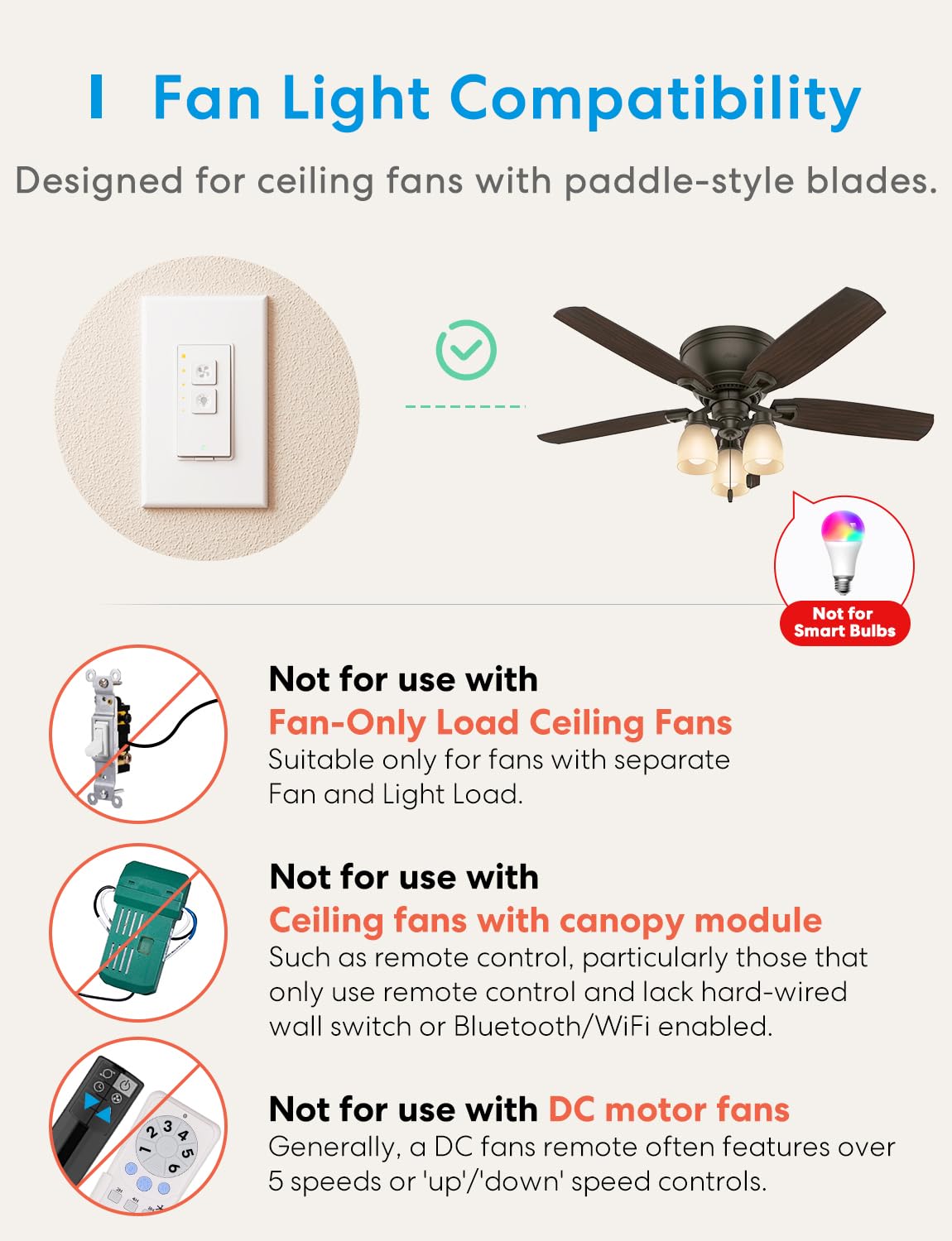 Q: Can I use this switch with smart bulbs?A: No, this smart ceiling fan switch is not compatible with smart bulbs. However, it works well with dimmable LED, CFL, or incandescent bulbs.