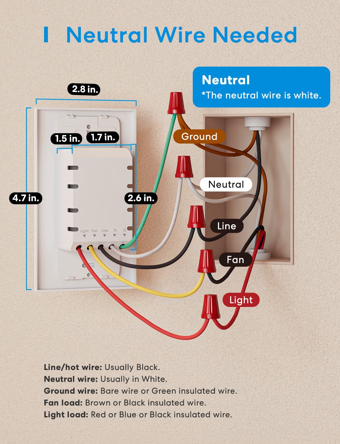 Check For Compatibility: Meross Smart Ceiling Fan Switch Is Not Compatible With Fans That Have A Built-In Remote Control/Bluetooth/Wi-Fi Control System, Dc Motor Fans, Or Exhaust Fans. Also, It Cannot Be Used For Your Smart Bulbs, But It Can Easily Pairs With Your Dimmable Led/Cfl Bulbs Or Inc Bulbs. Requires A Neutral Wire(Usually In White) And 2 Separate Load Wires For Your Ceiling Fan. And This Fan Light Dimmer Switch Only Supports 2.4G Wi-Fi (Not 5G) And Is Designed For Single-Pole (Not 3-Way) Use | Smart Fan And Light Switch Combo: This 2-In-1 Fan Control Switch With Light Supports 3 Speed Levels Or 4 Fan Speed Control (Customize The Settings According To Your Preferences) And Smoothly Dims Your Light From 1% To 100%. Adjust Fan Speeds And Lighting Brightness From Anywhere (With Internet Access) With The Meross App Or Apple Homekit App | Apple Homekit Compatible: The Ceiling Fan And Light Dimmer Switch Seamlessly Integrates With Popular Smart Home Platforms Including Apple Homekit, Amazon Alexa, Google Home, And Smartthings. You Can Simply Use Voice Commands To Control The Fan Dimmer Switch Combo Via Alexa, Siri And Google | Schedule And Timer: Create Schedules Or Countdowns To Set Your Light And Fan To Turn On/Off Automatically According To Your Daily Routines. It Looks Like Someone Is At Home When You Leave. Support Sunrise And Sunset Setting. Even If Your Internet Connection Is Accidentally Lost, The Preset Routines In The Meross App Will Continue To Run | Backlight Off And Energy Efficient: Customize The Smart Light Switch'S Led Light To Stays On Or Off, Providing An Undisturbed Sleep Environment By Reducing Unnecessary Light Pollution, And Promote Energy Saving In Your Home With This Smart Fan Light Switch | Sleek Design And User-Friendly: 2 Pack. Dimensions (W X D X H): 1.7 X 1.5 X 4.1 In. (Without Faceplate), 2.8 X 1.5 X 4.7 In. (With Faceplate). Fan Power: 120W Max. Light Power: 300W Inc Or 150W Led Or 150W Cfl Max