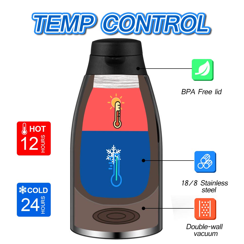 Single Hand Pouring: User-friendly design features a push-button pour spout for easy one-handed pouring. The exterior remains cool to the touch regardless of the beverage's temperature.