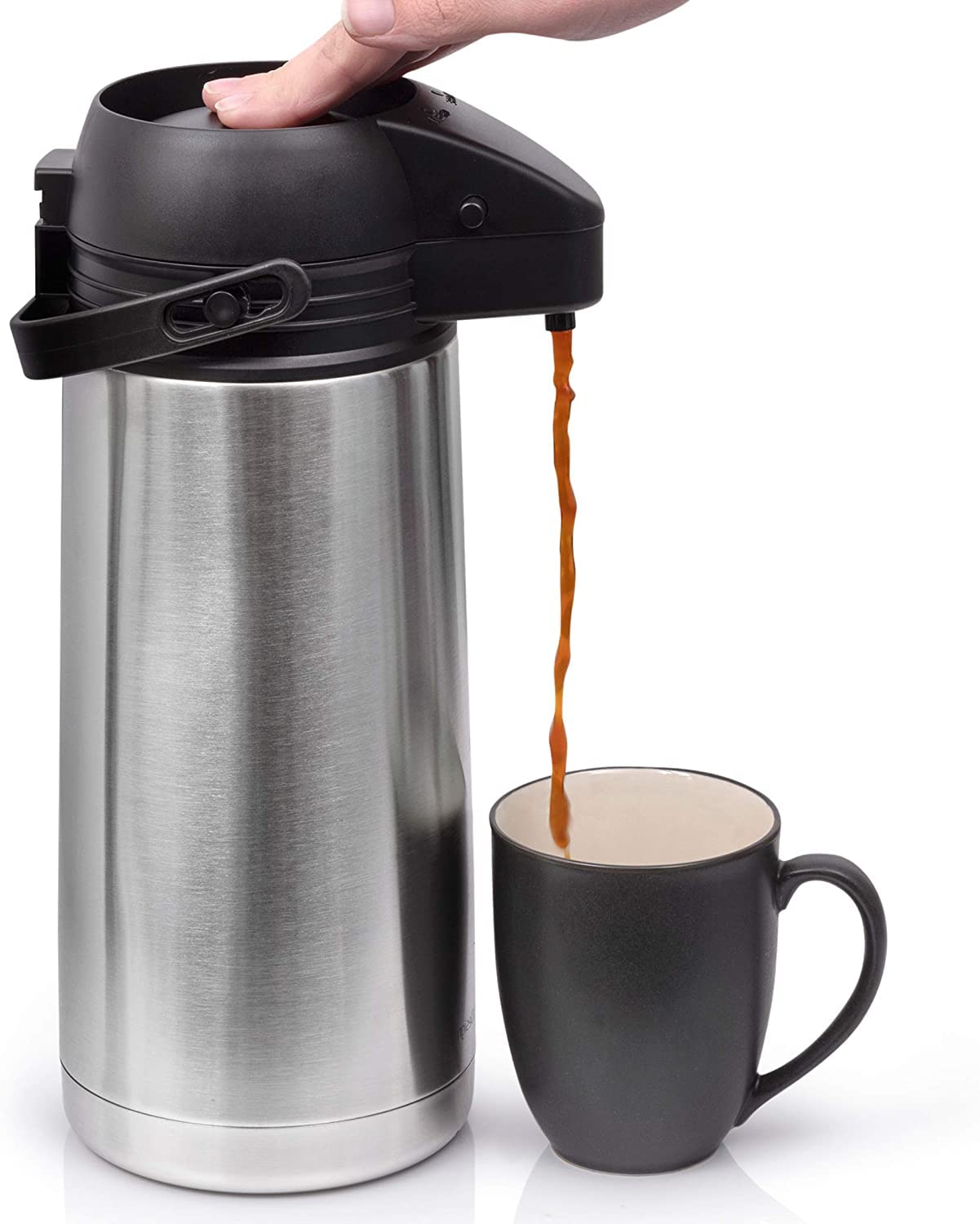 Q: What makes this coffee dispenser suitable for travel?A: The Airpot Coffee Dispenser is designed with travel in mind, featuring a locking push button that prevents accidental spills during transit. Its sturdy construction and cool-to-the-touch outer body provide added safety, making it perfect for road trips or picnics.