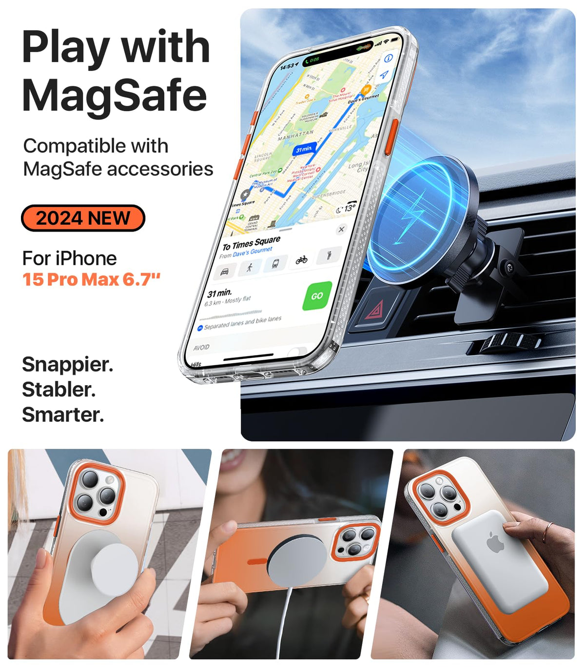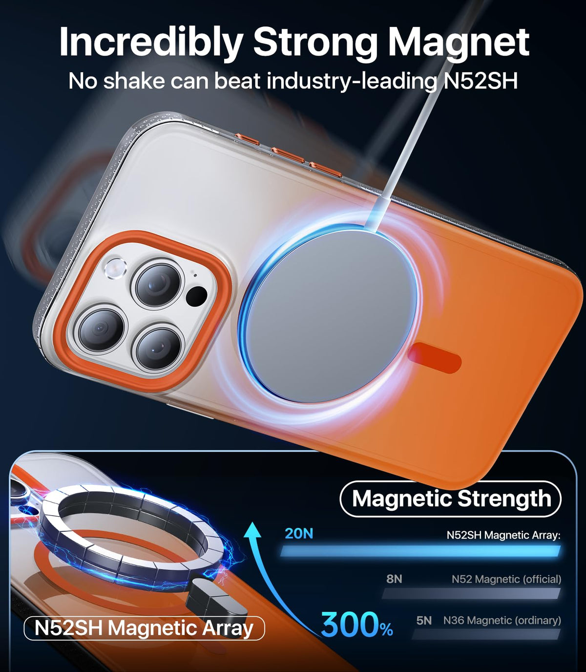 Q: What makes the magnetic feature of this case superior?A: The case utilizes Aulofe's exclusive N52SH strong magnet, providing a magnetic attraction force that is 300% stronger than standard MagSafe accessories, ensuring a secure fit and faster wireless charging speeds, up to 40W.