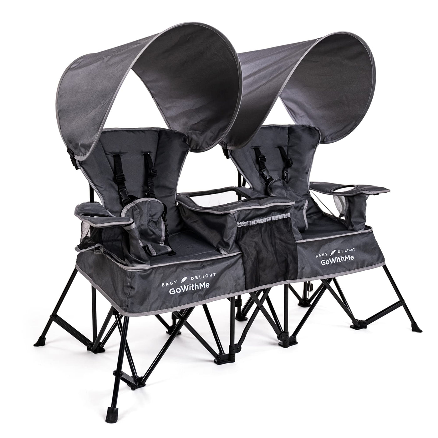 The Go With Me Duo Deluxe Portable Double Chair Is Perfect For Twins, Siblings Or Besties This One-Of-A-Kind Chair Unfolds To Reveal Two Separate Seating Areas For Little Ones Ages 3 Months - 75 Lbs Added Safety Features Include A Strong, Stable Flared Leg System, As Well As Locking Mechanisms And A 5-Point Safety Harness On Each Seat (Which Can Be Removed As The Children Grow) For Outdoor Adventures Two Removable Sun Shades Can Be Added Quickly And Easily The Built-In Cup Holders Are Sure To Come In Handy For Bottles As Well As Sippy Cups And For Storing Snacks, Toys Or Books, Easily Accessible Storage Pockets Are Included Between The Two Seats When Itas Time To Get Up And Go, Simply Fold The Duo Up And Place It Into The Included Storage Bag Ready Set Adventure, Together