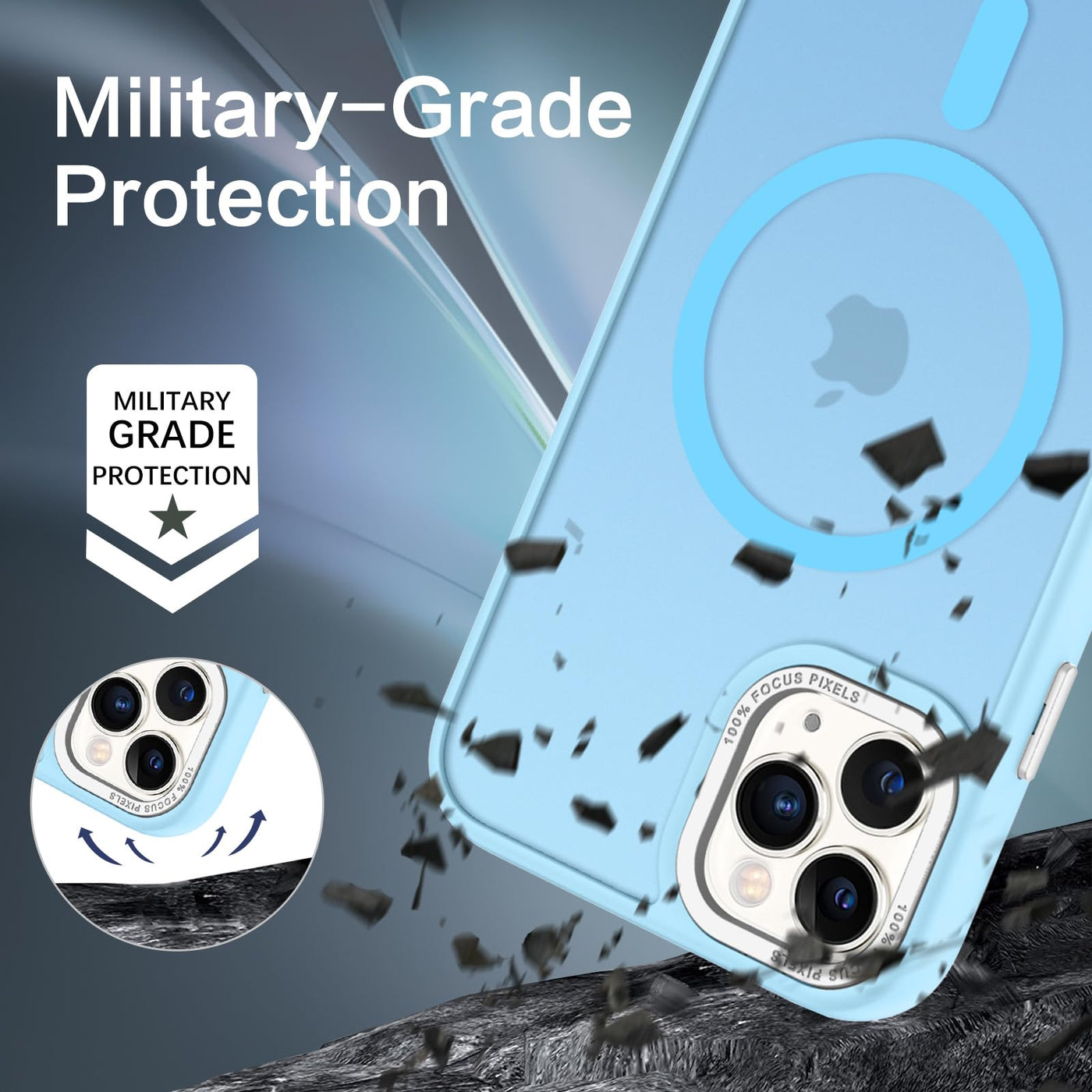 Q: What level of protection does this case provide?A: This case offers military-grade drop protection, featuring SGS&ROHS certification. It includes exclusive Shock 360° airbags and strong rubber bumpers for shock absorption, along with a raised screen lip and camera bezel to prevent scratches.