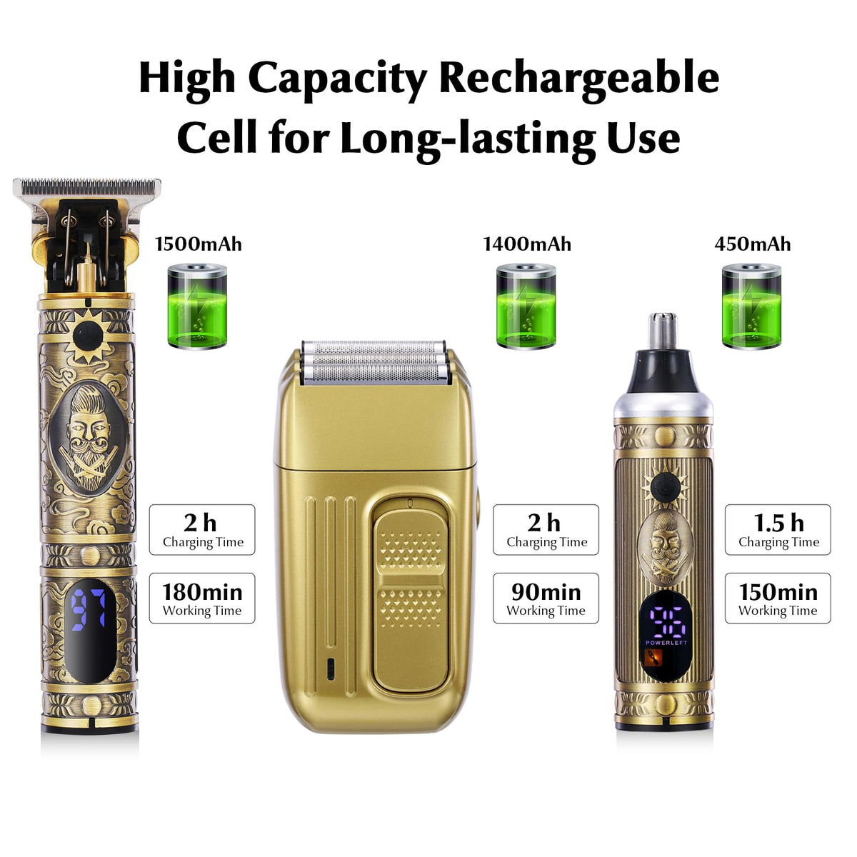 Features: Lcd Display For Cell Volume, Energy Prompt, High Clear Display. Including 1Mm, 2Mm, 3Mm, 4Mm Guide Combs And A Cleaning Brush, You Can Precisely Trim Hair And Get The Hairstyle You Want Easily. Refined Steel Cutting H Ead, Ergonomic Handheld Design, Fit Your Hand, Comfortable To Use. Comes With Usb C-Harging Port Design, Flexible To Be Charged And Built-In High Capacity Rechargeable Cell For Long-Lasting Use. Nice For Hair Salon And For The Old And The Young Baby To Get Modern Haircut At Home. Specifications: Color: Gold Size Of Guide Comb: 1Mm, 2Mm, 3Mm, 4Mm Power Voltage: 100-240V / Haircutter 10W, Shaver 5W, Nasal Trimmer 5W. Battery Capacity: 1500/1400/450Mah (Hairdresser/ Shaver/ Nose Hair) Hair Cutter: 2 Hours Charge, 180 Minutes Use Shaver: 2 Hours Charge, 90 Minutes Use Nose Hair Cutter: 1.5 Hours Charge, 150 Minutes Use Package List: 1 * Hair Cutters 1 * Razor 1 * Nose Hair Remover 3 * Usb Cable 1 * Comb 2 * Head Protection Cover 2 * Cleaning Brush 1 * Nose Hair Cutter Head 4 * Limit Comb(1/2/3/4Mm)