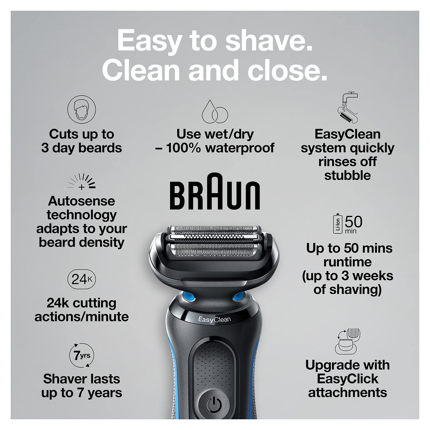 Braun Series 5 Electric Shaver For Men Makes Shaving Easy With 3 Flexible Blades That Adapt To Your Facial Contours. The Easyclean System Delivers A Fast And Easy Cleaning Without Removing The Shaver Head. The Li-Ion Battery Provides Up To 3 Weeks Of Shaving And A 5 Min Quick Charge. This Men'S Electric Razor Is 100% Waterproof For Wet & Dry Use. Compatible With Easyclick System. Beard Trimmer Attachment Included. Includes: 1X Series 5 Razor For Men - Blue 1X Beard Trimmer Attachment 1X Charging Stand 1X Protective Cap 1X Smart Plug For Automatic 100-240 Voltage Adjustment 1X Cleaning Brush