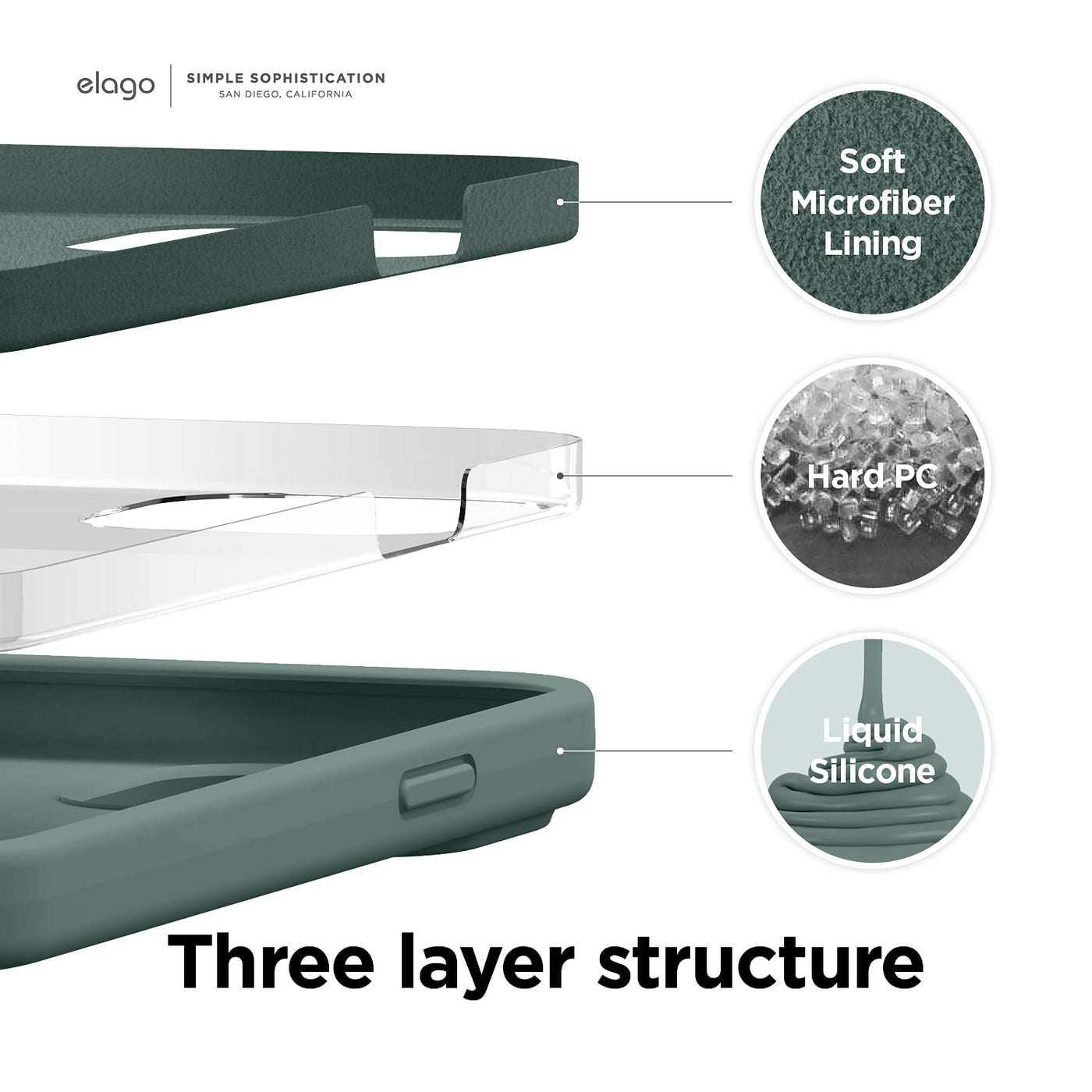 Q: What materials are used in the elago Liquid Silicone Case?A: The elago Liquid Silicone Case is made from high-quality silicone, PC, and microfiber, providing excellent grip and protection.