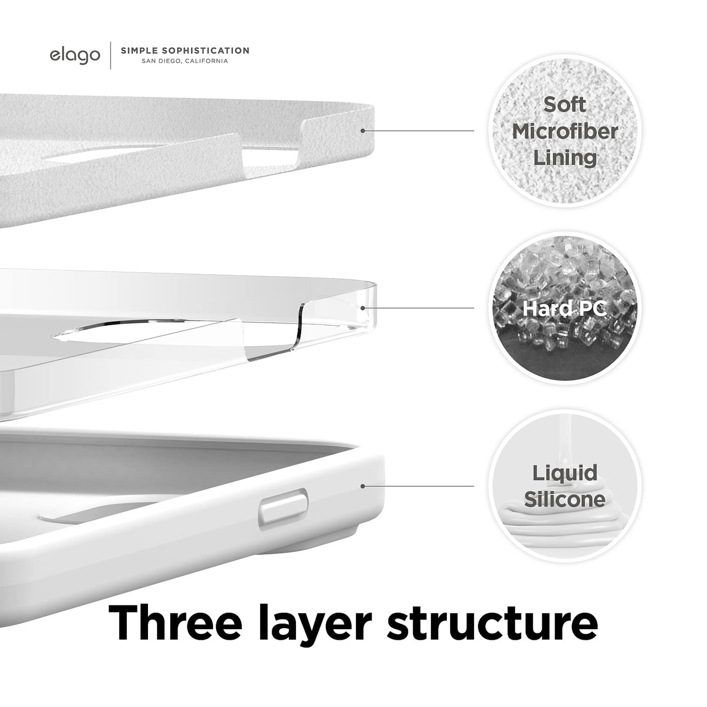 Q: How does the elago Liquid Silicone Case protect my phone?A: This case offers full body protection with a durable 3-layer structure that includes liquid silicone, hard PC, and a soft microfiber lining, preventing scratches and providing shockproof protection.