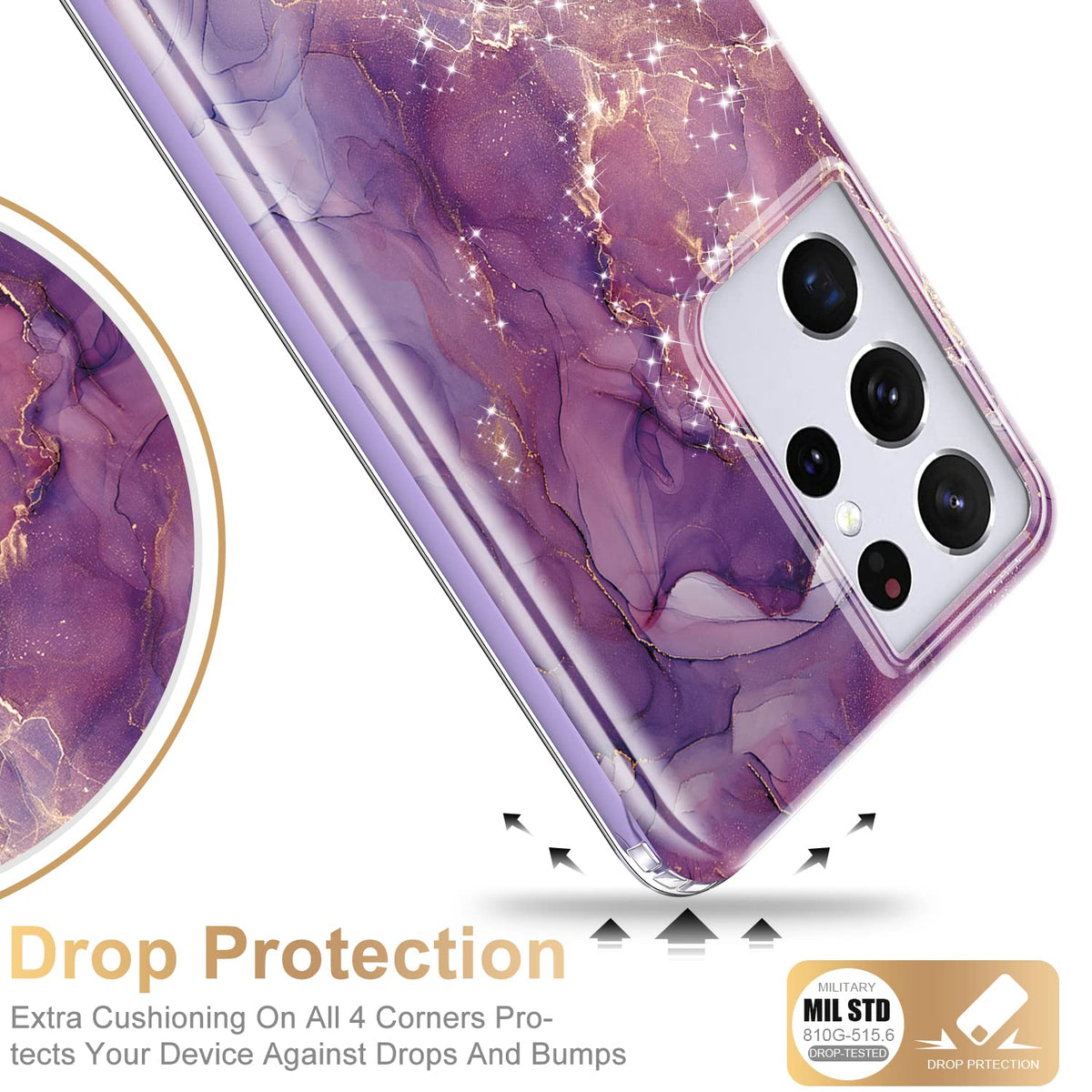 Q: What is the design style of the Esdot Galaxy S21 Ultra case?A: The case features a stylish and elegant Glitter Purple Marble design, making it a fashionable accessory for women and girls. Its slim and lightweight design adds minimal bulk while enhancing your style.