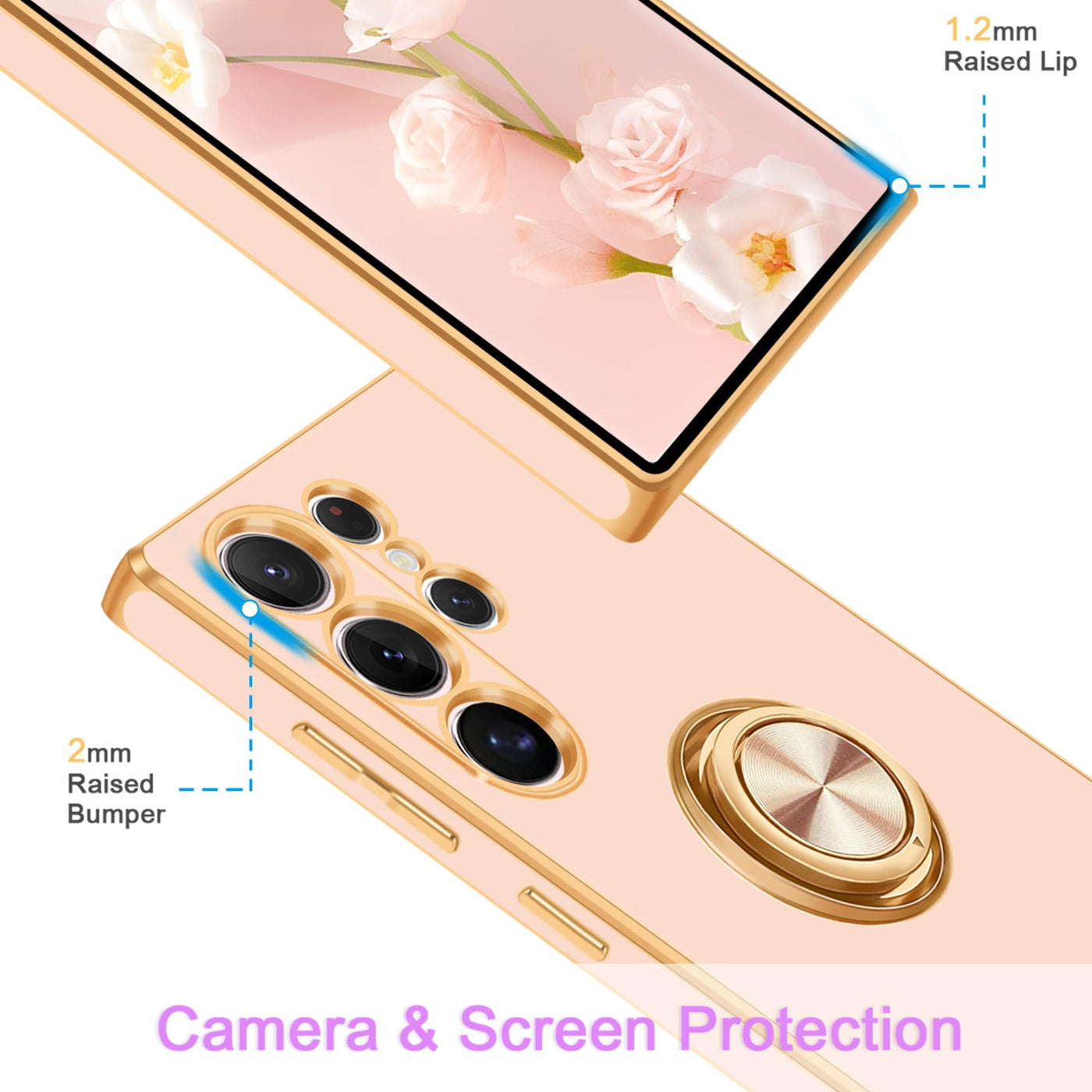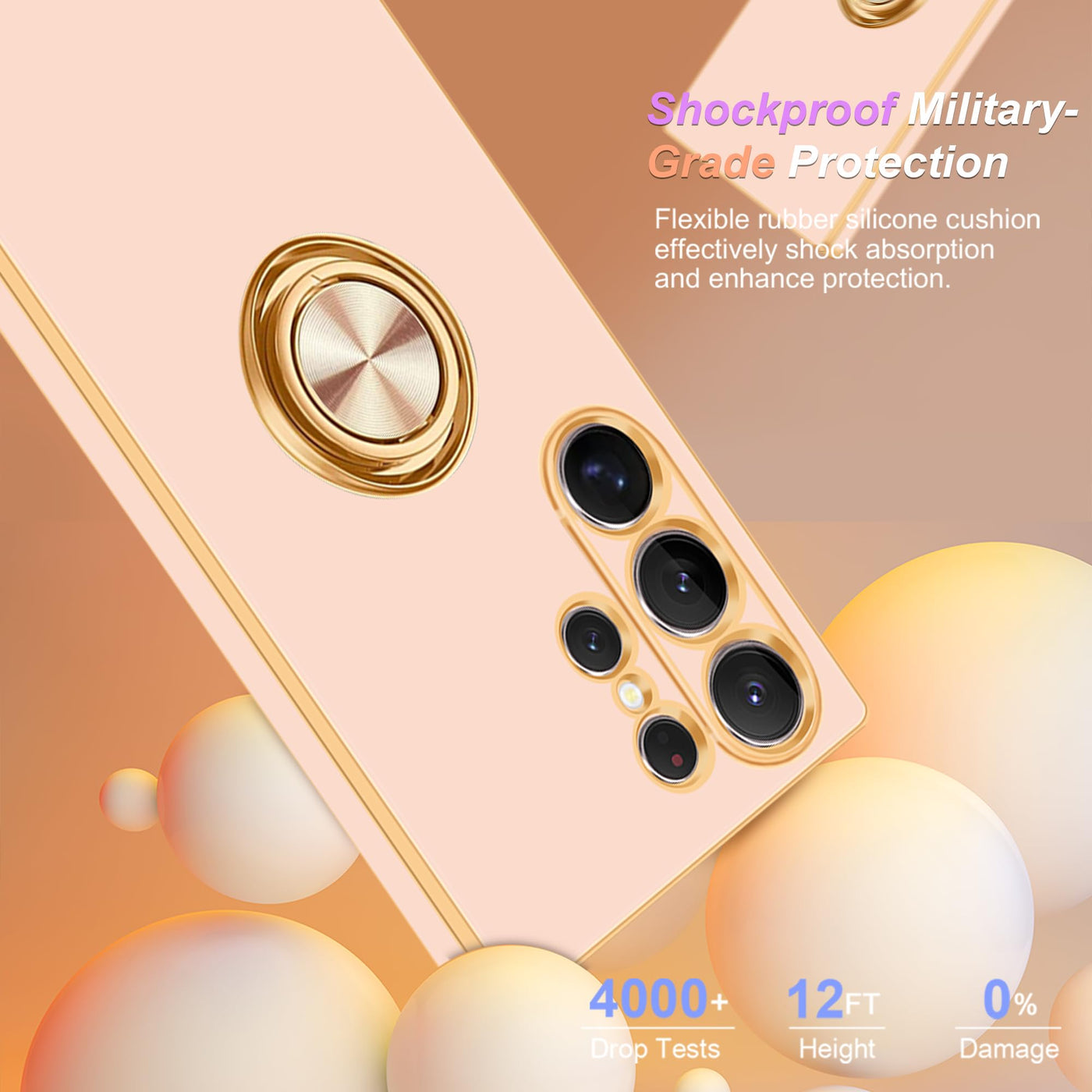 Fingic Samsung Galaxy S24 Ultra Pink Case With 360 Rotatable Ring Holder Magnetic Kickstand Slim Soft Tpu Rugged Bumper Shockproof Protective Cover Case For Galaxy S24 Ultra For Women Girls Specifications: Compatible Model:For Samsung Galaxy S24 Ultra,6.8 Inch(5G,2024 New Released) 2. Color:Rose Gold/Gold Package Includes: 1X Cell Phone Case For Samsung Galaxy S24 Ultra Key Features: 1.Fingic Hybrid Pink Samsung Galaxy S24 Ultra Case Provides Shock Absorption And Scratch Prevention While Maintaining A Slim Profile. 2.Built-In A Ring Kickstand, Which Can Rotate 360 Horizontally And 180 Vertically. 3.Metal Plate On The Ring Back Can Attach To Magnetic Car Mount For Navigation When Driving. 4. This S24 Ultra Case Made With Soft Tpu Material, With Glitter Gold Plated Edges, Sleek,Has A Beautiful Appearance And Comfortable Hands Feeling. 5.Interior A Soft Felt Lining Further Protects The Screen From Scratches Or Abrasions. 6.Raised Lip Protects The Front Screen And The Back Camera Lens From Shockproof And Drop Protection. 7.Precise Cutouts Make All Buttons, Speakers And Charging Ports Easily Accessible. Questions & Answers: 1.Does This Galaxy S24 Ultra Case Compatible With Wireless Charging? Not Compatible With Wireless Charging Becuase Of The Ring Holder. 2.Does This Samsung S24 Ultra Case Have A Built In Screen Protector ? Not Including A Screen Protector,But It Is Friendly To A Screen Protector. 3.Does This Case Fit For Samsung Galaxy S24 Plus+/S24? Not Fit For.