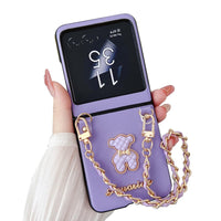 For Moto Razr Plus 2023 Case Cute Bear Design For Women Girls, Luxury Leather Protective Slim Case With Chain For Motorola Razr