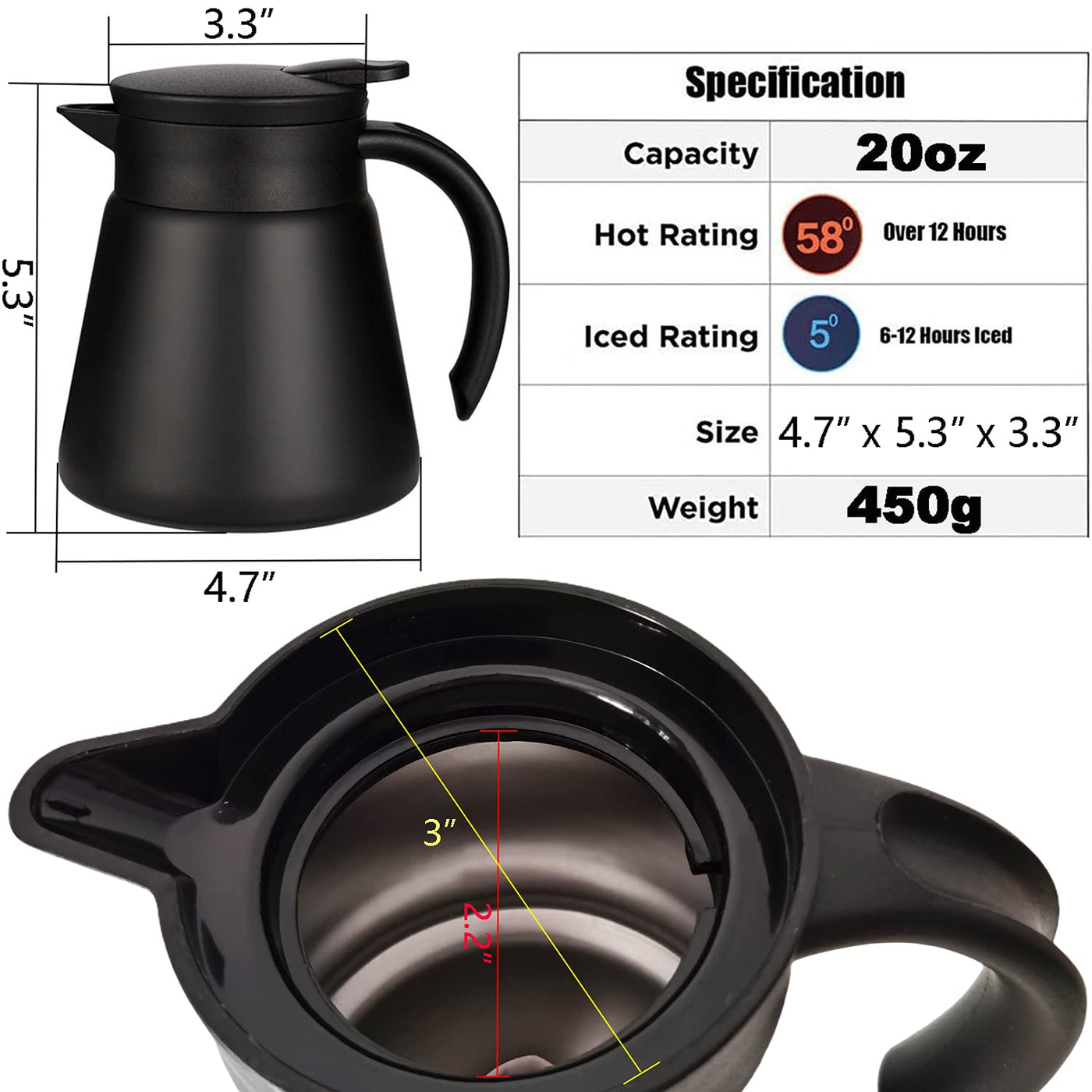 Goeielewe Thermal Coffee Carafe Tea Pot 20 Oz Stainless Steel Insulation Pot Double Wall Vacuum Insulated Coffee Water & Beverage Dispenser (Black)