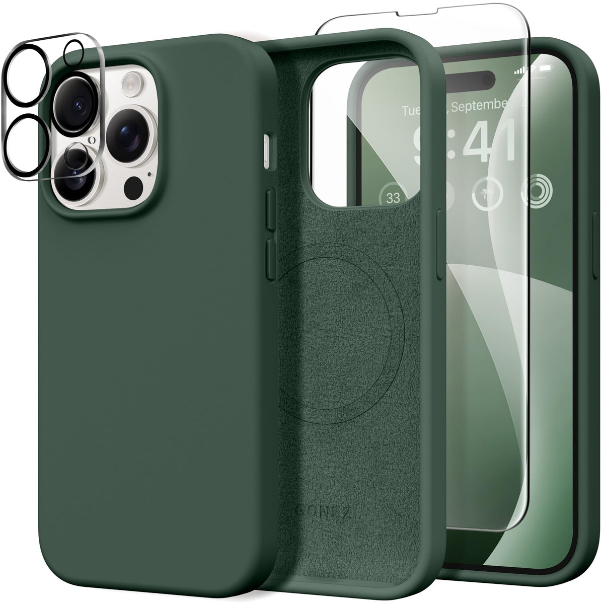 Gonez For Iphone 14 Pro Max Case Silicone, Compatible With Magsafe, With 2X Screen Protector + 2X Camera Lens Protector, Liquid Silicone Shockproof Protective Iphone 14 Promax Case, Dark Green