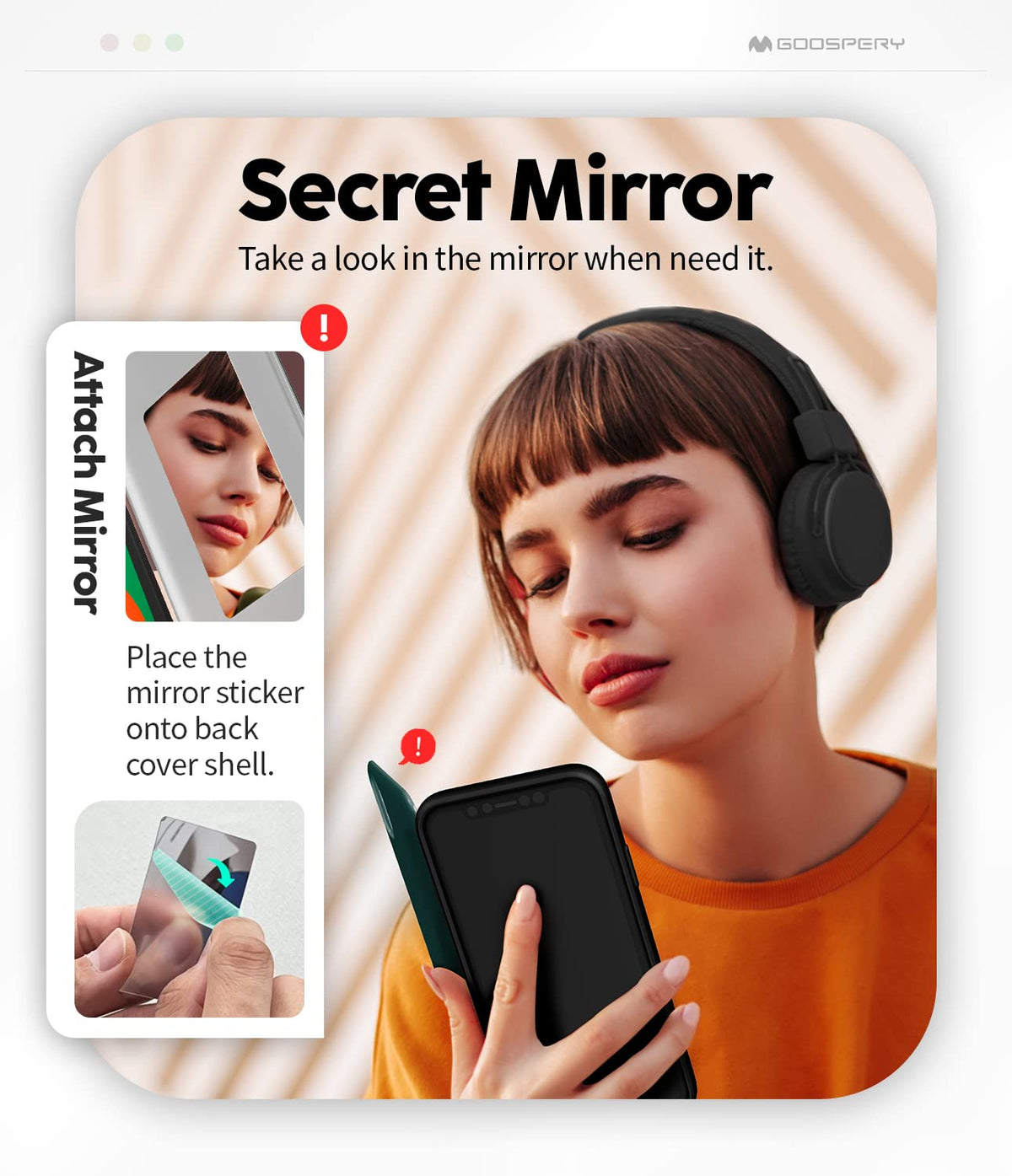 Q: Does the case have a built-in mirror, and how do I use it?A: Yes, the case features a hidden mirror inside the back cover, which can be accessed easily. Just remember to remove the scratch-resistant film before use.