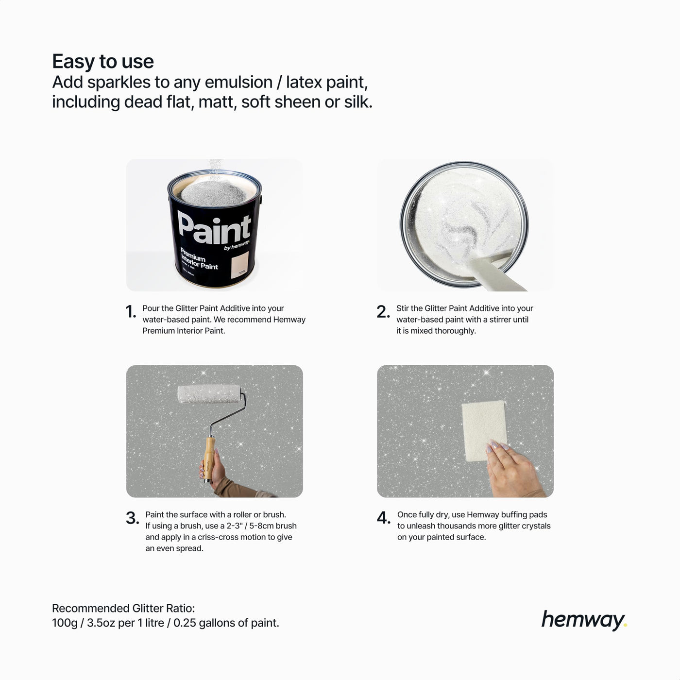 Q: What surfaces can I use Hemway Glitter Paint Additive on?A: Hemway Glitter Paint Additive is versatile and can be used on various surfaces including interior and exterior walls, wood, varnish, and furniture. It works well with water-based paints, making it ideal for adding a sparkly finish to ceilings, walls, and more.
