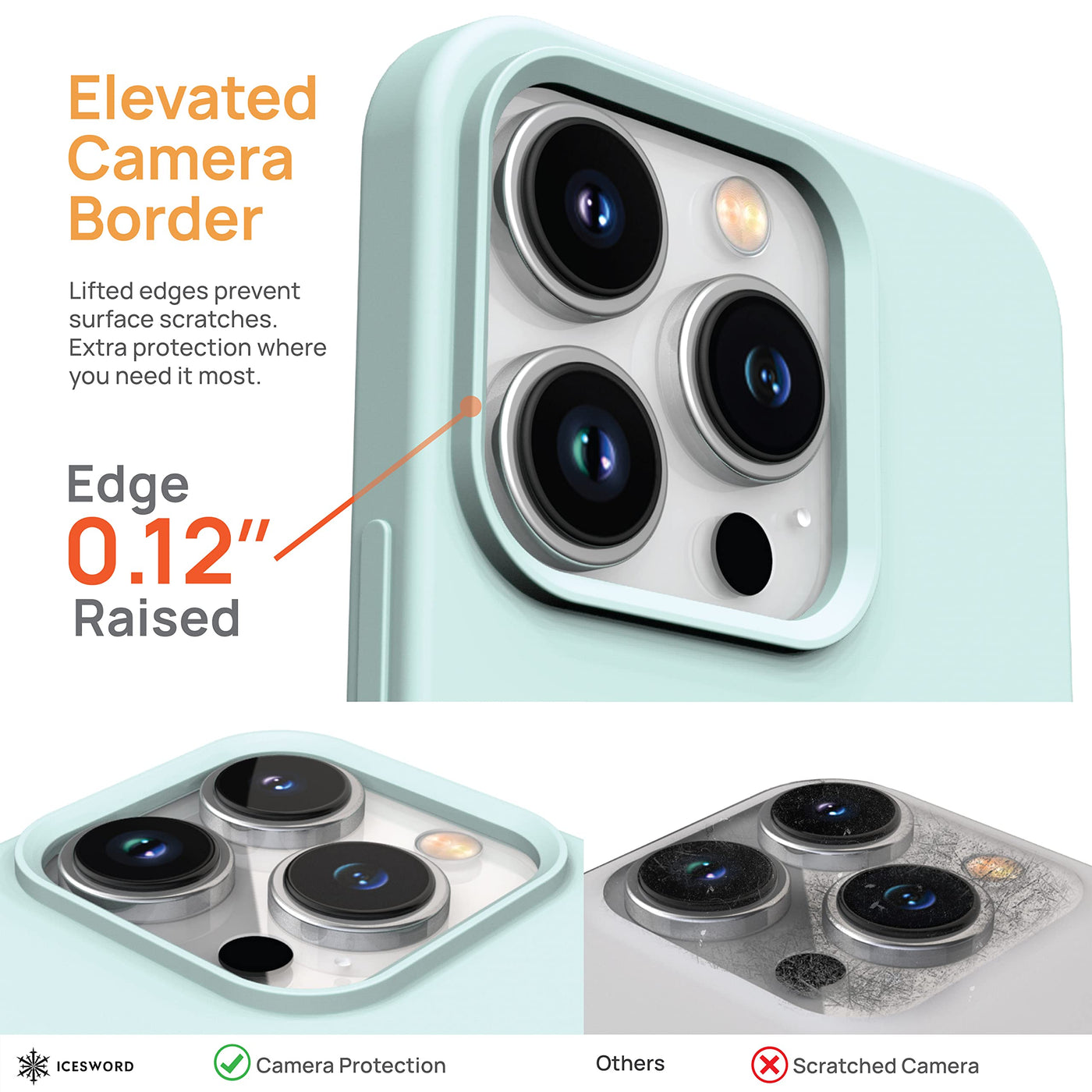 Q: How does the IceSword case protect the camera lens of my iPhone 13 Pro Max?A: The case features a protective camera design with a concave hole that covers the camera lens, preventing scratches when laying your phone down.