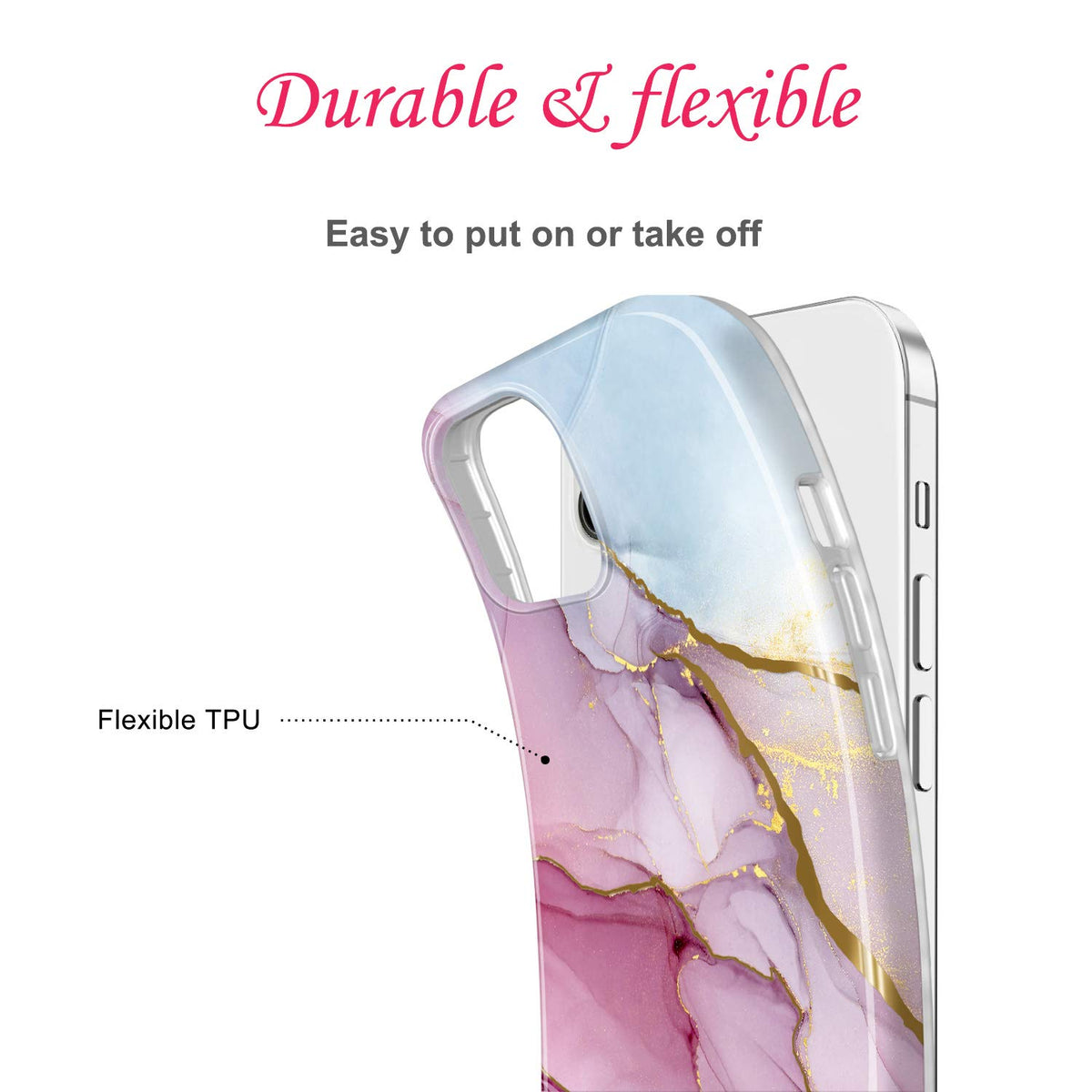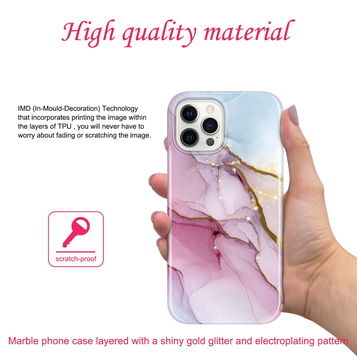 Q: How does the IMD Technology enhance the design of this phone case?A: IMD Technology is used in the JIAXIUFEN case to ensure a vivid and durable print. This method helps maintain the beauty of the marble design layered with shiny gold metallic patterns, which resist fading over time.