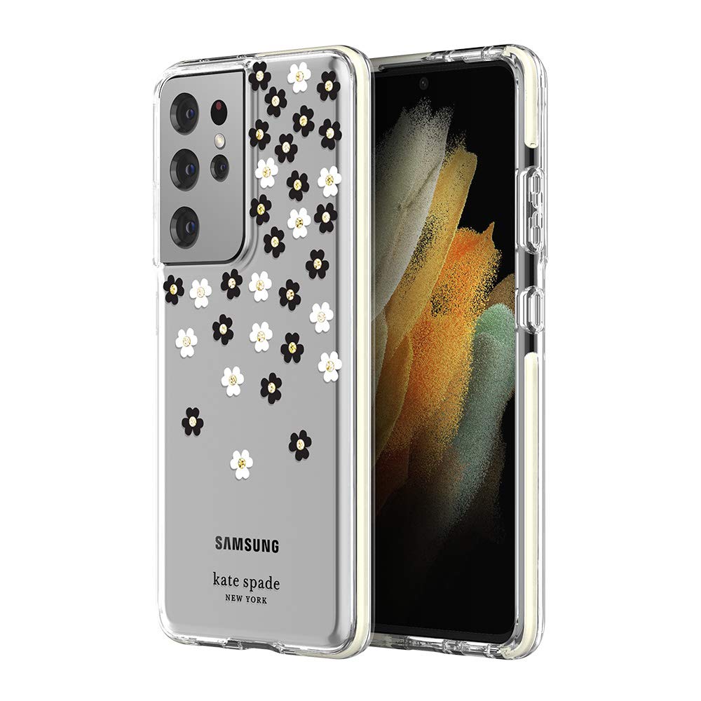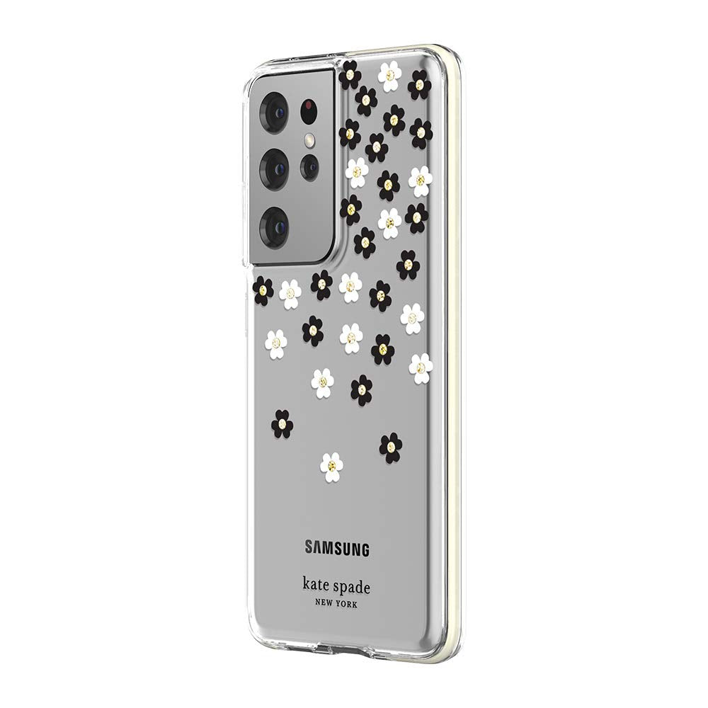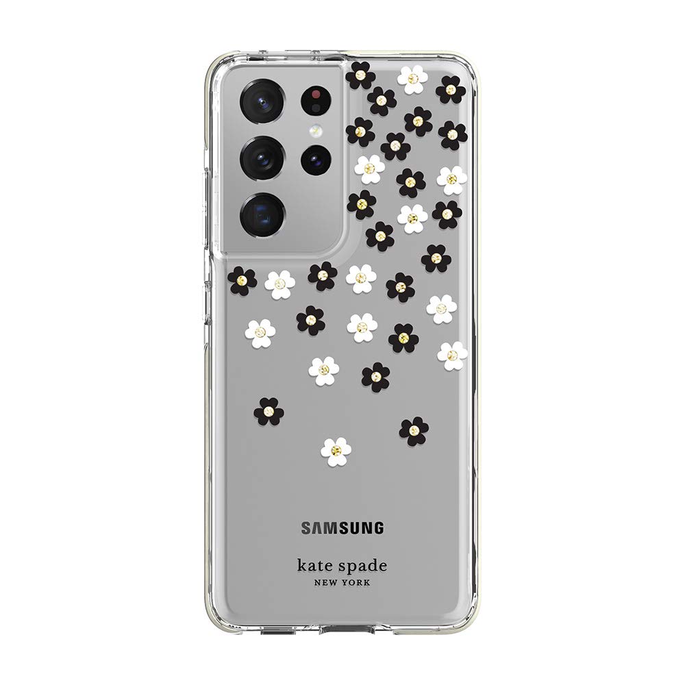 Kate Spade New York Defensive Hardshell Case Compatible With Samsung Galaxy S21 Ultra 5G Scattered Flowers Black/White/Gold Gems/Clear/White Bumper