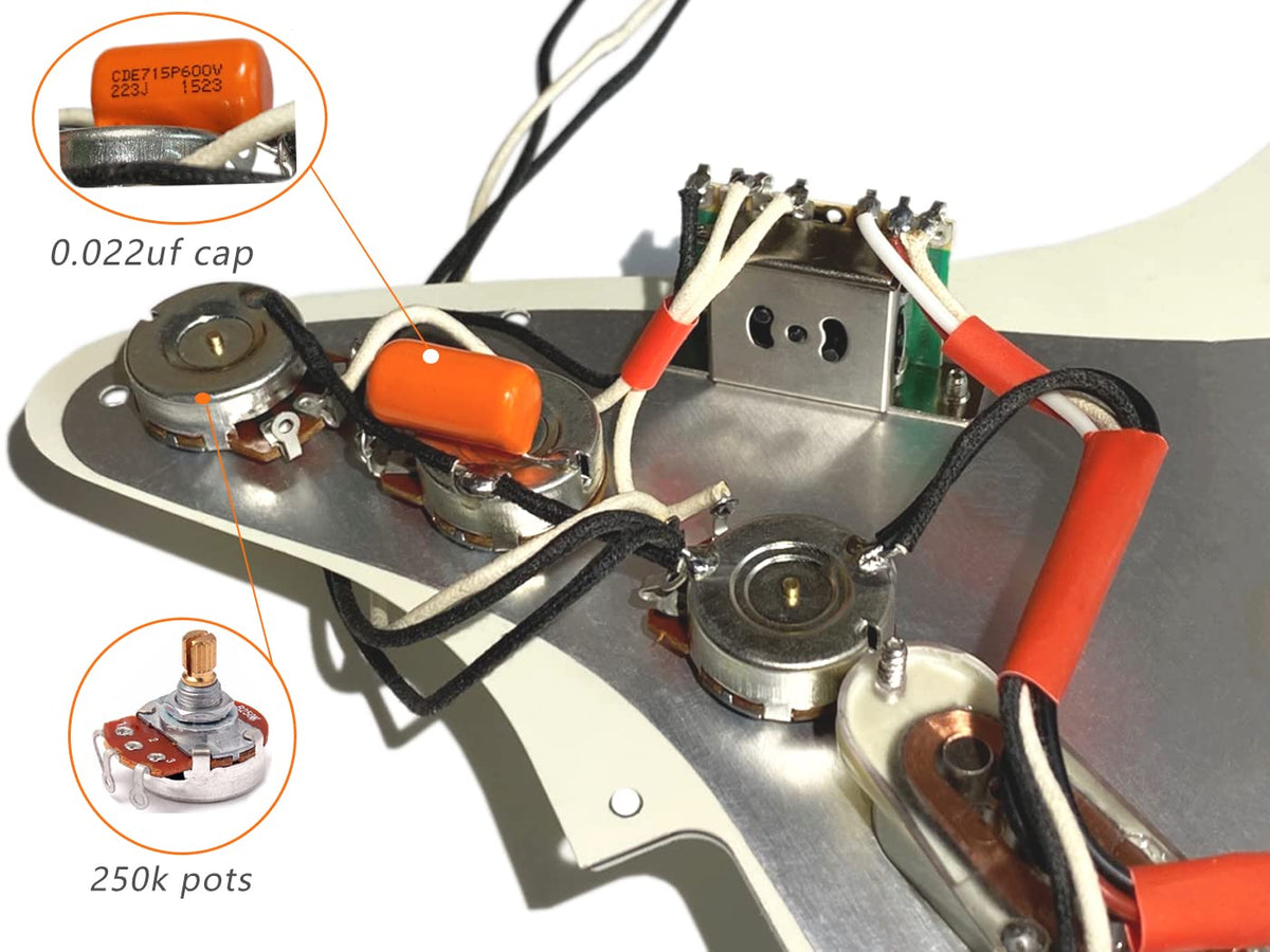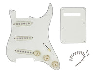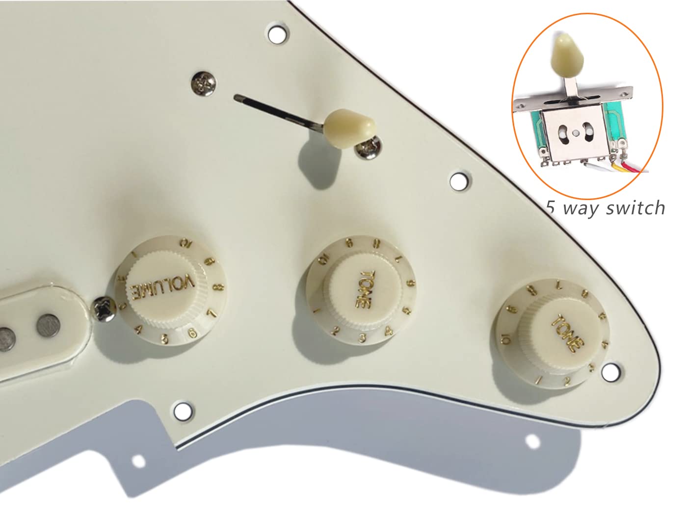 Alnico 5 Pickups -Vintage 50S Tone; Beveled Pole Piece; Stylish Clear Bobbins; Output Of Neck Pick-Up: 7.4Ko; Mddle P'Up: 8.6Ko (Reverse-Wound To Eliminate Hum); Bridge P/U: 9Ko Electronics - - Import 5 Way Pick-Up Switch; Full Size A250/B250K Potentiometer; 0.022Uf, 600V Orange Capacitance, Drop-In Pick Guards - 3-Ply Pick Guards With Large Back Shielding, Fully Loaded Pick Ups & Controls (Pup Switch, 1 Volume, 2 Tone); Simply Solder 2 Black Wires To Ground And The White Wire To Hot Of Output Jack Application - Compatible With Fender Stratocaster Series Electric Guitars With 11 Mounting Holes, Standard Triple Single Coil Pick Ups Configuration; Please Check The Specifications On Photo Gallary, Off White Packages - Included 1 X Prewired 6 String Electric Guitar Pick Guards; 1 X Backplate; 17 X Mounting Screws