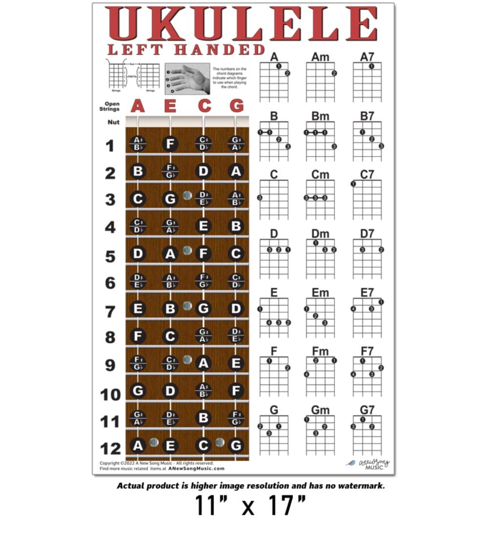 This Is A Great Learning Tool For Beginning And Intermediate Left Handed Ukulele Players The 11 X 17 Instructional Guide Is Nice To Hang On The Wall Wherever You Practice For Easy Reference, Instead Of Flipping Through A Book This Chart Includes The Notes Of The Ukulele Displayed On The Fretboard And A Chord Chart This Information Can Be Found In Books, But Rarely On One Easy To Read Chart Made In The Usa