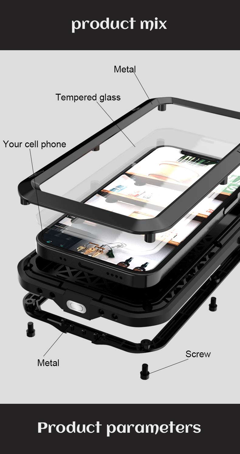Brand: Love Mei Compatible Model With Iphone 12 Material: Metal / Aluminum / Silicone / Tempered Glass Main Features: Shockproof, Drop Proof, Dirt Proof, Waterproof, Scratch Proof, Full Body Protections Color : Black, White, Red, Silver,Yellow , Army Green Military Grade Drop Protection: Made Up Of A Heavy-Duty Machined Aluminum Frame, While Inside, Soft Silicone Wraps Around Your Phone, Absorbing And Deflecting Any Shock Your Device Experiences On Impact. Heavy Duty: Made Of Alluminum Through Special Craft Processing, The Visual And Craft Is Perfectly Combined After The Installation. Wireless Charger : Supports Wireless Charging Without Remove The Case. Unique Design Allows Easy Access To All Controls And Ports Without Having To Remove Case. All Buttons, Ports, And Camera Lenses Remain Unrestricted. Easy To Put On And Easy To Take Off. Installation Note: 1. Do Not Tighten The Screws With Too Much Force. It Could Stripe The Threads Or Deform The Rubber Sealing And Compromise Performance. 2. The Product Comes With Built-In Screen Protector. Please Remove Your Own Screen Protector (If You Have One) Before Installing It. Note Weatherproof, Can Simply Protect Your Mobile From The Rain Or The Sudden Water Damage, It Can Face Water Resistant, And Rainproof, But Not Put In Water. Package Includes 1 X Super Sturdy Case Campatibal For Iphone 12 ,1 X Cleaning Cloth,1 X Lanyard Sling,1 X User Manual (Must Read),1 X Screwdriver