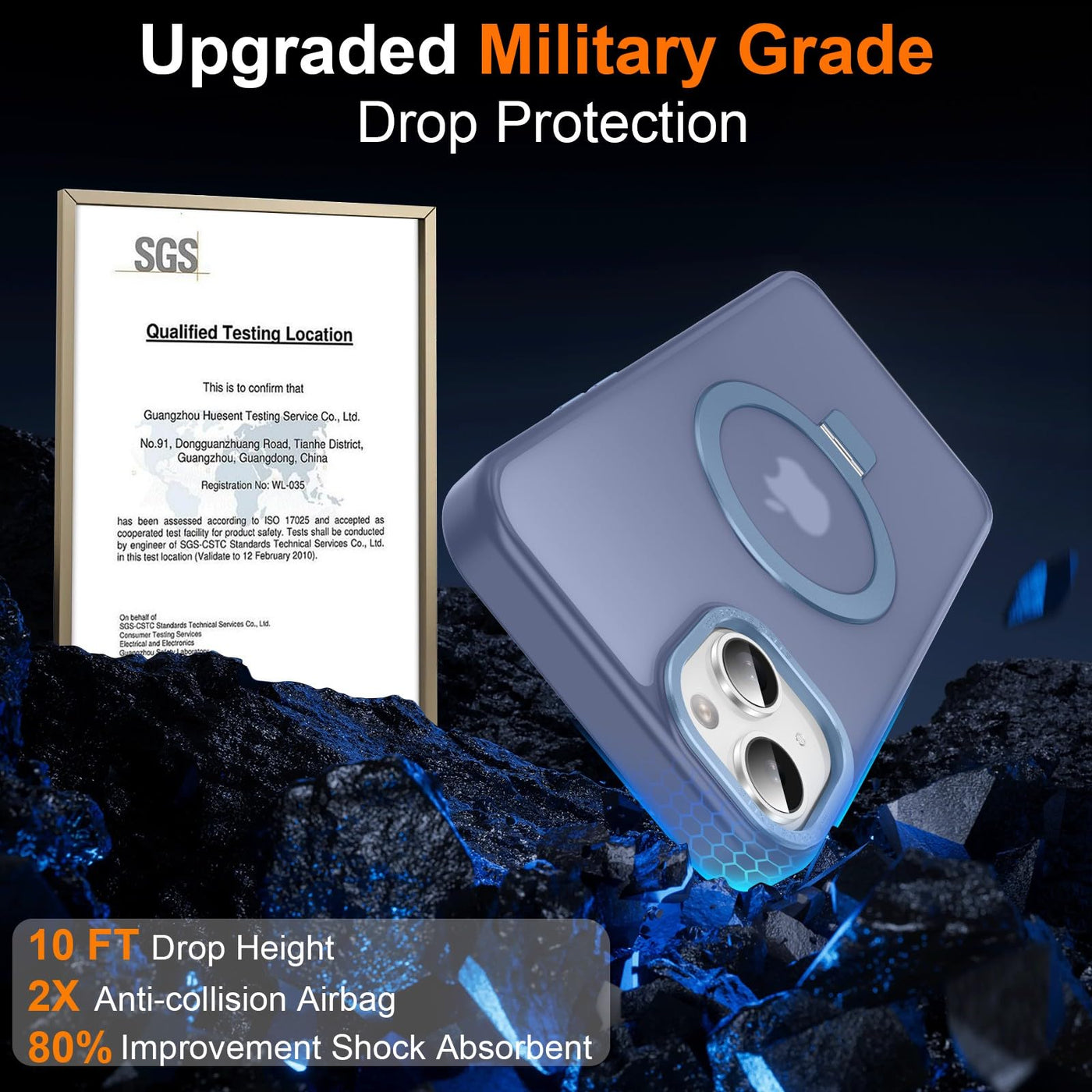 Q: What type of protection does the Lufanbis Magnetic iPhone 15 Plus case offer?A: The Lufanbis Magnetic case provides military-grade protection, tested to withstand drops from heights of up to 8 feet. It features multiple cushioning structures, including soft silicone and inner shock-absorbing airbags, ensuring your device is safe from fumbles and drops.