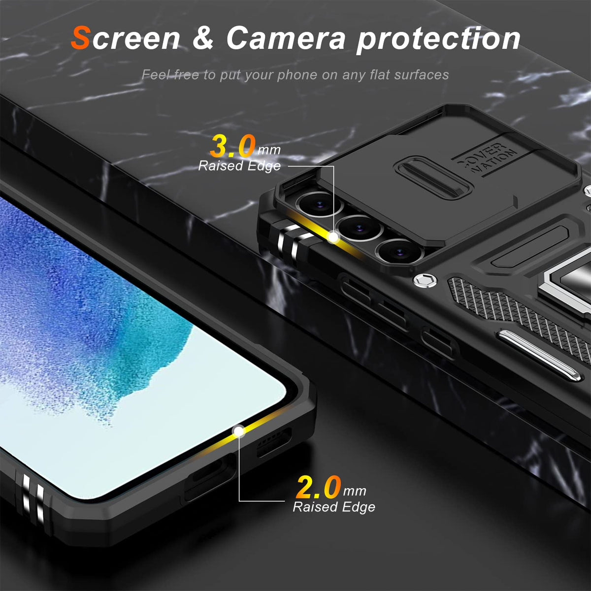 Magnetic Kickstand Protective Phone Case With Camera Cover For Samsung Galaxy S21 Fe Slide Camera Cover Protects Camera Against Scratch-Resistant Surfaces Impact Resistant Airbag On Four Corners To Absorb And Disperse Shock Easy Access To Buttons, Ports And Cameras Drop Protection, Dust Protection, Scratch Protection Built-In Functional Kickstand Works Perfectly With Magnetic Car Mount Holder Features: Slim-Fit Durable Protective Shockproof Tactile Buttons Package Included: 1 X Heavy Duty Phone Case For Samsung Galaxy S21 Fe 2 X Screen Protectors Please Note: This Samsung Galaxy S21 Fe Phone Case Has A Lifetime Warranty If You Have Any Displeasure About The Product Or Service In Our Store, Please Just Feel Free To Contact Us Here, We Will Get Back To You In 24 Hours And Provide A Resend Or Refund For You Until You Satisfied In Lumarke, Customer Satisfaction Is Our Top Pursuit