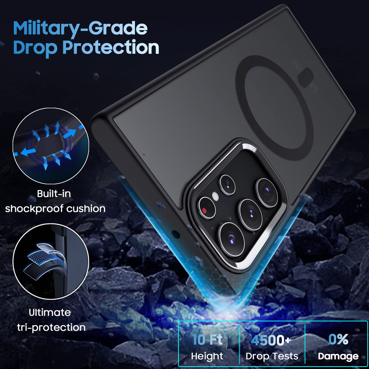Q: How does the case protect against drops and impacts?A: The MAKAVO case offers military-grade drop protection with a solid back cover and soft edges that absorb most impacts, providing robust protection for your Samsung Galaxy S22 Ultra.