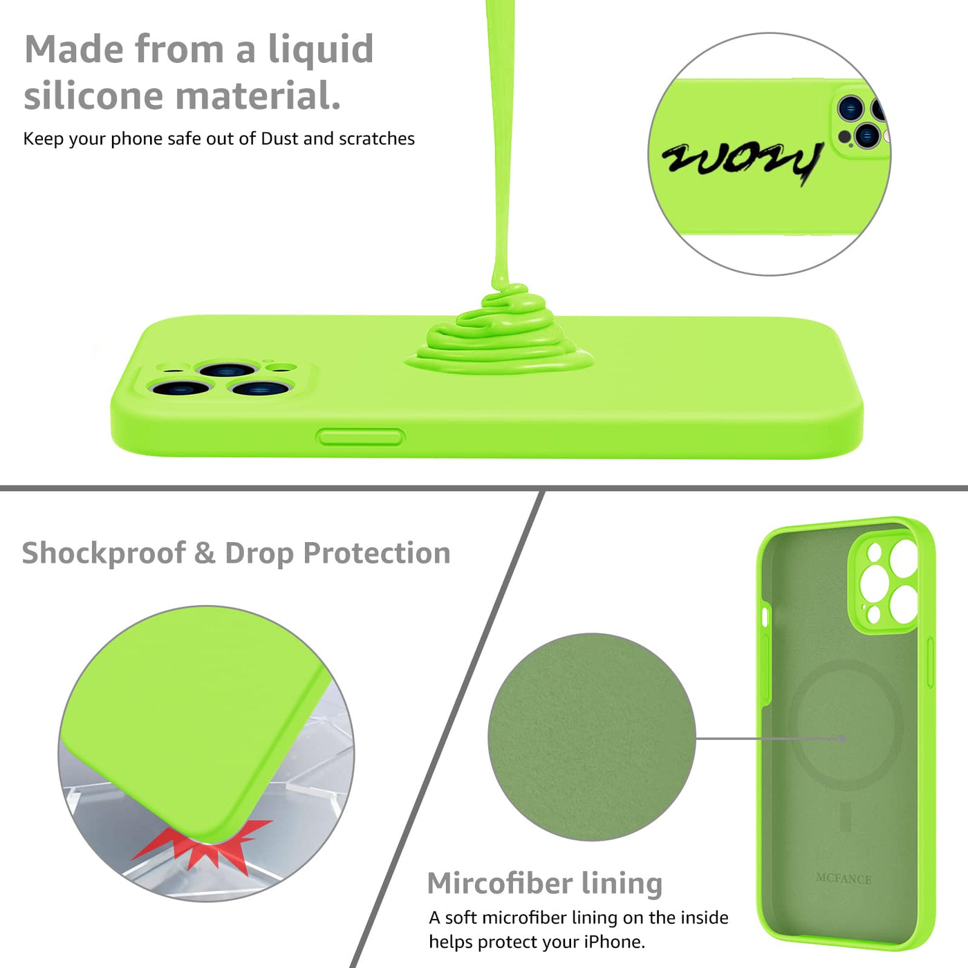 Q: What materials are used in the MCFANCE iPhone 12 Pro Max case?A: The case is made from liquid silicone rubber, which provides a silky-soft touch and good grip, along with anti-fingerprint and scratch-resistant features.