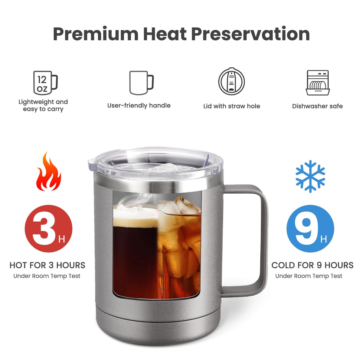 Q: How long can the MEWAY 12oz Coffee Mug keep drinks hot or cold?A: The MEWAY 12oz Coffee Mug is designed with double wall vacuum insulation, which keeps your beverages scalding-hot for over 3 hours and icy-cold for up to 9 hours.