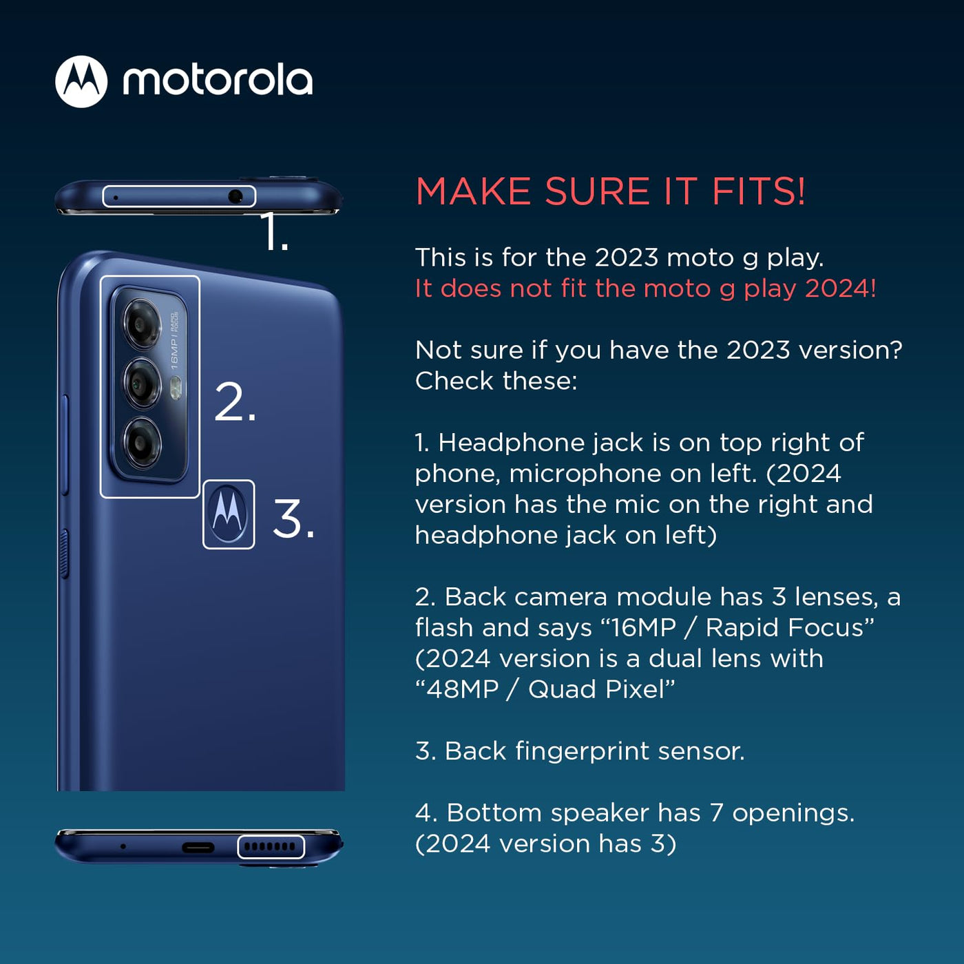 Q: Is the Motorola Moto G Play (2023) textured protective case compatible with other Moto G models?A: No, this textured protective case is specifically designed for the Motorola Moto G Play (2023) model. It ensures a precision fit, which maintains access to all buttons and ports without obstruction.