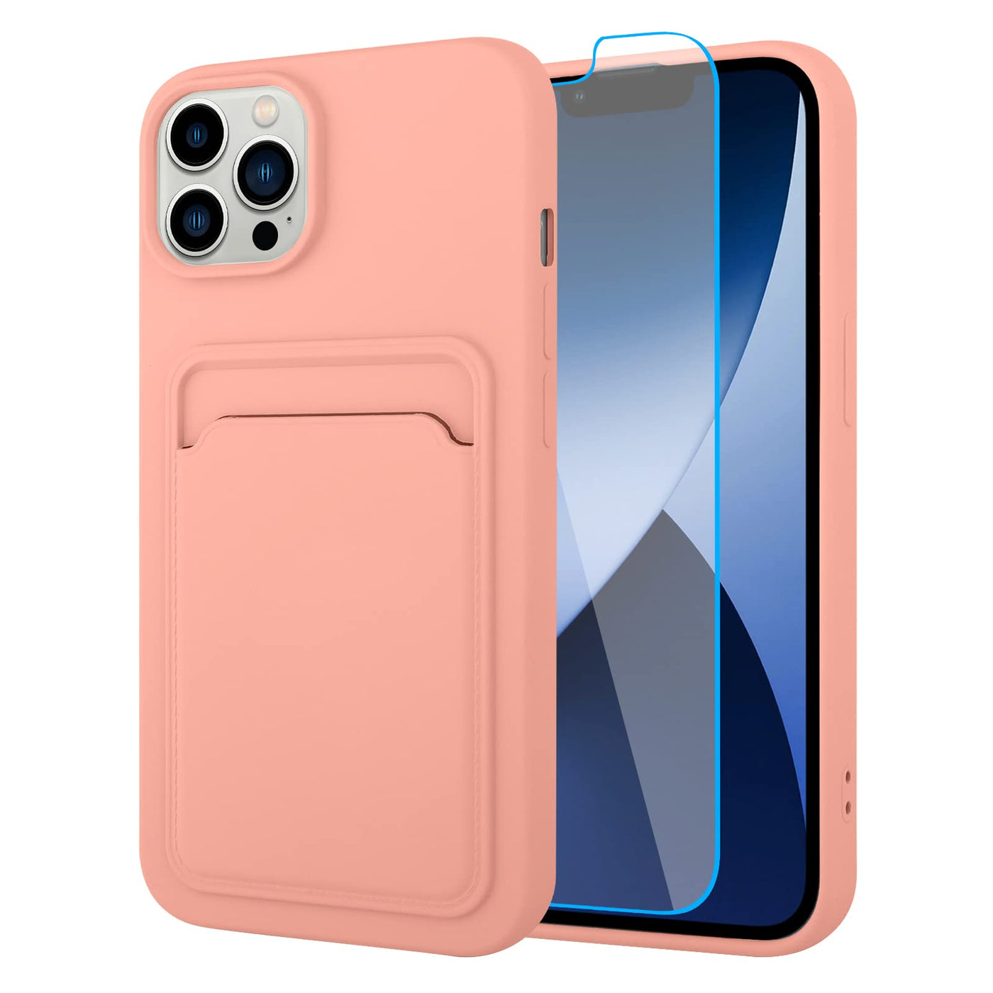 Mzelq Cell Phone Case For Iphone 14 Pro Max, Silicone Wallet Card Holder, Camera Protection, Screen Protector, Pink