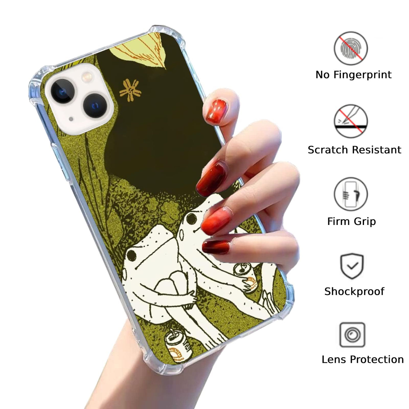 Q: How does the Nsyosio Reto Frogs Case protect my phone?A: This case offers military-grade protection with impact-resistant TPU and features like corner airbags to absorb shocks from drops of up to 15 feet. It also has raised lips to safeguard your camera and screen.