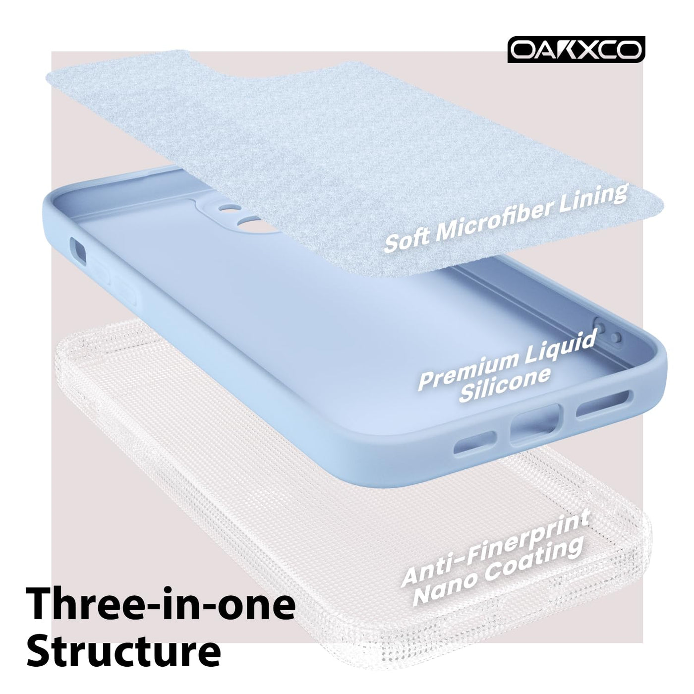Q: What materials are used in the oakxco phone case?A: The oakxco phone case is made from high-quality liquid silicone, providing a baby skin-like soft touch, along with a hybrid dual layer that includes flexible silicone and a clear hard PC with a microfiber lining for added protection.