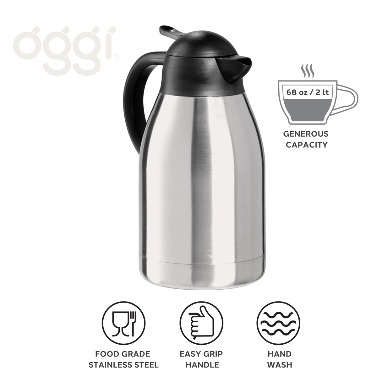 No More Burnt Coffee! Oggi'S Catalina 68Oz Stainless Steel Thermal Coffee Carafe Is Perfect For Your Daily Coffee Or A Stylish Sleek Way To Serve Coffee For A Buffet Or Dinner Party At The End Of A Long Week. With Double Walled Vacuum Insulation, It'S Stainless Steel Thermal Liner Keep Beverages Hotter Longer With Excellent Temperature Retention As Well As Maintaining The Freshness Of A Brewed Pot Of Coffee Or Other Hot Beverages. Keeps Contents Hot For 6-8 Hours, Making It A Working From Home Essential. It Should Not Be Limited To Just Coffee, Prepare Hot Chocolate For The Kids On A Cold Night Or Keep Water Hot To Refill Your Cup Of Tea. It Also Works Well For Cold Beverages Too! A Press Button Top Makes For A Quick Pour To Minimize The Impact On The Beverage Temperature While Easily Allowing You To Pour With One Hand. Fill The Carafe With Hot Water (Or Cold Water For Cold Beverages) Or A Few Minutes Prior To Adding Your Hot Beverage. Wash By Hand Or Fill With Ice Cubes Easily With The Wide Mouth Opening. To Ensure The Highest Quality Possible It Is Recommended That You Hand Wash This Product.