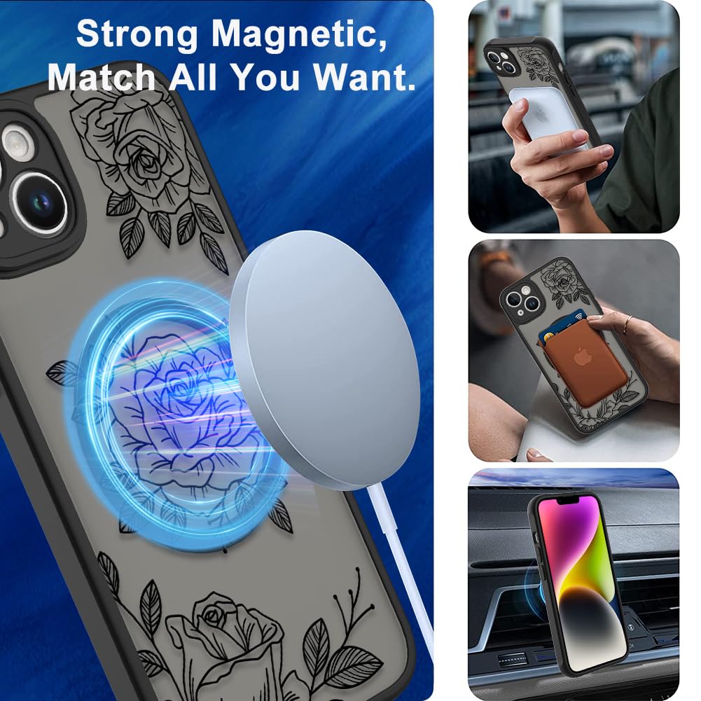 Ook Magnetic For Iphone 14 Plus Case Black Flower Floral Pattern [Compatible With Magsafe] Slim Translucent Matte Camera Lens Pr