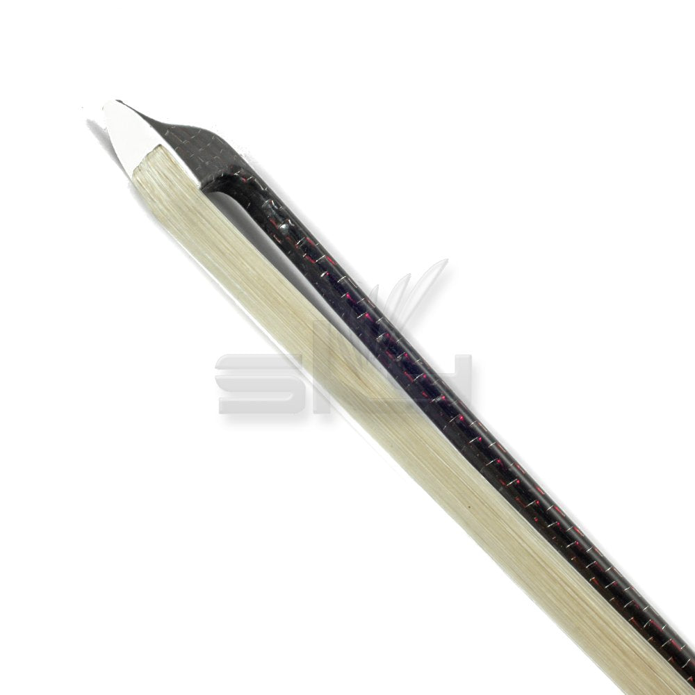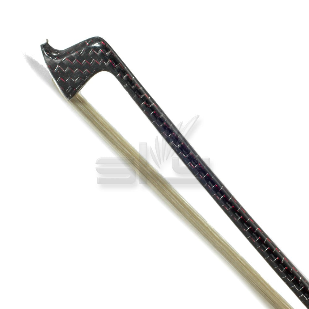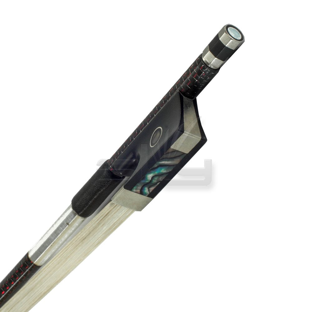 Brand New High Quality Red Silver Inlaid Patterned Carbon Fiber Violin Bow With Abalone Inlays Hand Carved With High Gloss Finish Round Stick, Ebony Frog, Double Pearl Eye, Genuine Unbleached Mongolian Horsehair Fully Lined, Silver Wrap And Leather Bow Grip Lightweight And Easy To Carry, Very Strong And Stable Good Stiffness, Good Control And Response Bright Sound And Soft On Fingers